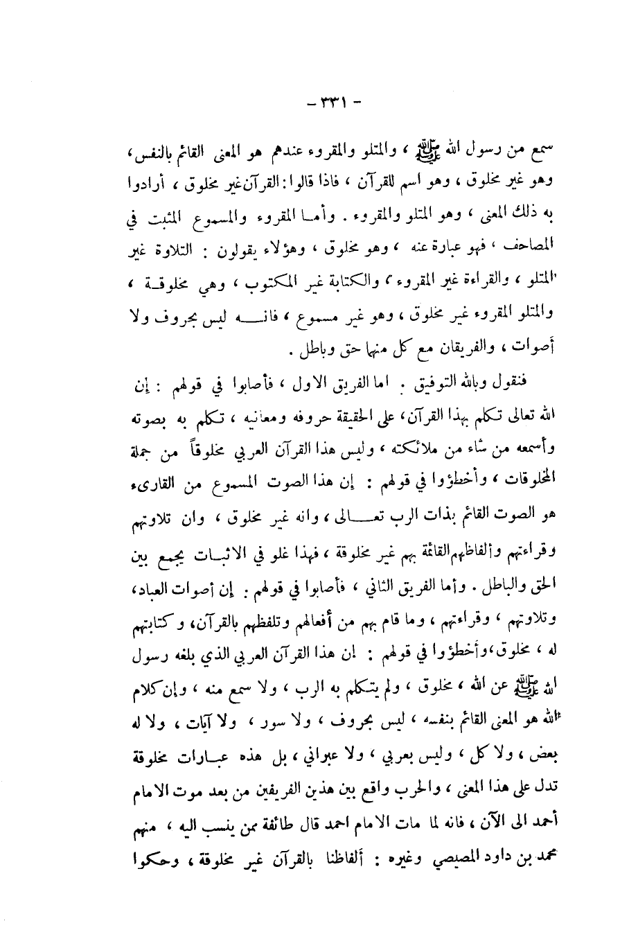 سمع من رَسُول الله صلى الله عَلَيْهِ وَسلم والمتلو والمقروء عِنْدهم هُوَ الْمَعْنى الْقَائِم بِالنَّفسِ وَهُوَ غير مَخْلُوق وَهُوَ اسْم لِلْقُرْآنِ فاذا قَالُوا الْقُرْآن غير مَخْلُوق أَرَادوا بِهِ ذَلِك الْمَعْنى وَهُوَ المتلو والمقروء واما المقروء والمسموع الْمُثبت فِي الْمَصَاحِف فَهُوَ عبارَة عَنهُ وَهُوَ مَخْلُوق وَهَؤُلَاء يَقُولُونَ التِّلَاوَة غير المتلو وَالْقِرَاءَة غير المقروء وَالْكِتَابَة غير الْمَكْتُوب وَهِي مخلوقة والمتلو المقروء غير مَخْلُوق وَهُوَ غير مسموع فانه لَيْسَ بحروف وَلَا أصوات وَالْفَرِيقَانِ مَعَ كل مِنْهُمَا حق وباطل