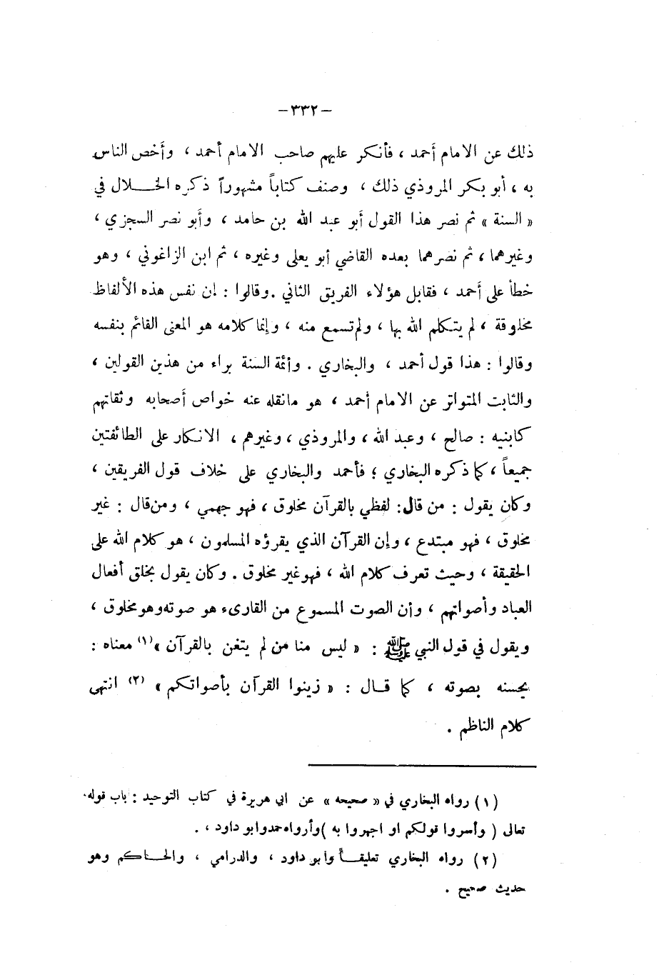 ذَلِك عَن الامام أَحْمد فَأنْكر عَلَيْهِم صَاحب الامام أَحْمد وأخص النَّاس بِهِ أَبُو بكر الْمَرْوذِيّ ذَلِك وصنف كتابا مَشْهُورا ذكره الْخلال فِي (السّنة ثمَّ نصر هَذَا القَوْل أَبُو عبد الله بن حَامِد وَأَبُو نصر السجْزِي وَغَيرهمَا ثمَّ نصرهما بعده القَاضِي أَبُو يعلى وَغَيره ثمَّ ابْن الزَّاغُونِيّ وَهُوَ خطأ على أَحْمد فقابل هَؤُلَاءِ الْفَرِيق الثَّانِي وَقَالُوا إِن نفس هَذِه الالفاظ مخلوقة لم يتَكَلَّم الله بهَا وَلم تسمع مِنْهُ وَإِنَّمَا كَلَامه هُوَ الْمَعْنى الْقَائِم بِنَفسِهِ وَقَالُوا هَذَا قَول أَحْمد وَالْبُخَارِيّ وأئمة السّنة برَاء من هذَيْن الْقَوْلَيْنِ وَالثَّابِت الْمُتَوَاتر عَن الامام أَحْمد هُوَ مَا نَقله عَنهُ خَواص أَصْحَابه وثقاتهم كابنيه صَالح وَعبد الله والمروذي وَغَيرهم الانكار على الطَّائِفَتَيْنِ جَمِيعًا كَمَا ذكره البُخَارِيّ فَأَحْمَد وَالْبُخَارِيّ على خلاف قَول الْفَرِيقَيْنِ وَكَانَ يَقُول من قَالَ لَفْظِي بِالْقُرْآنِ مَخْلُوق فَهُوَ جهمي وَمن قَالَ غير مَخْلُوق فَهُوَ مُبْتَدع وَإِن الْقُرْآن وَإِن الْقُرْآن الَّذِي يَقْرَؤُهُ الْمُسلمُونَ هُوَ كَلَام الله على الْحَقِيقَة وَحَيْثُ تعرف كَلَام الله فَهُوَ غير مَخْلُوق وَكَانَ يَقُول بِخلق أَفعَال الْعباد وأصواتهم وَأَن الصَّوْت المسموع من القارىء هُوَ صَوته وَهُوَ مَخْلُوق وَيَقُول فِي قَول النَّبِي صلى الله عَلَيْهِ وَسلم (لَيْسَ منا من لم يَتَغَنَّ بِالْقُرْآنِ (مَعْنَاهُ يُحسنهُ بِصَوْتِهِ كَمَا قَالَ (زَينُوا الْقُرْآن بِأَصْوَاتِكُمْ (انْتهى كَلَام النَّاظِم