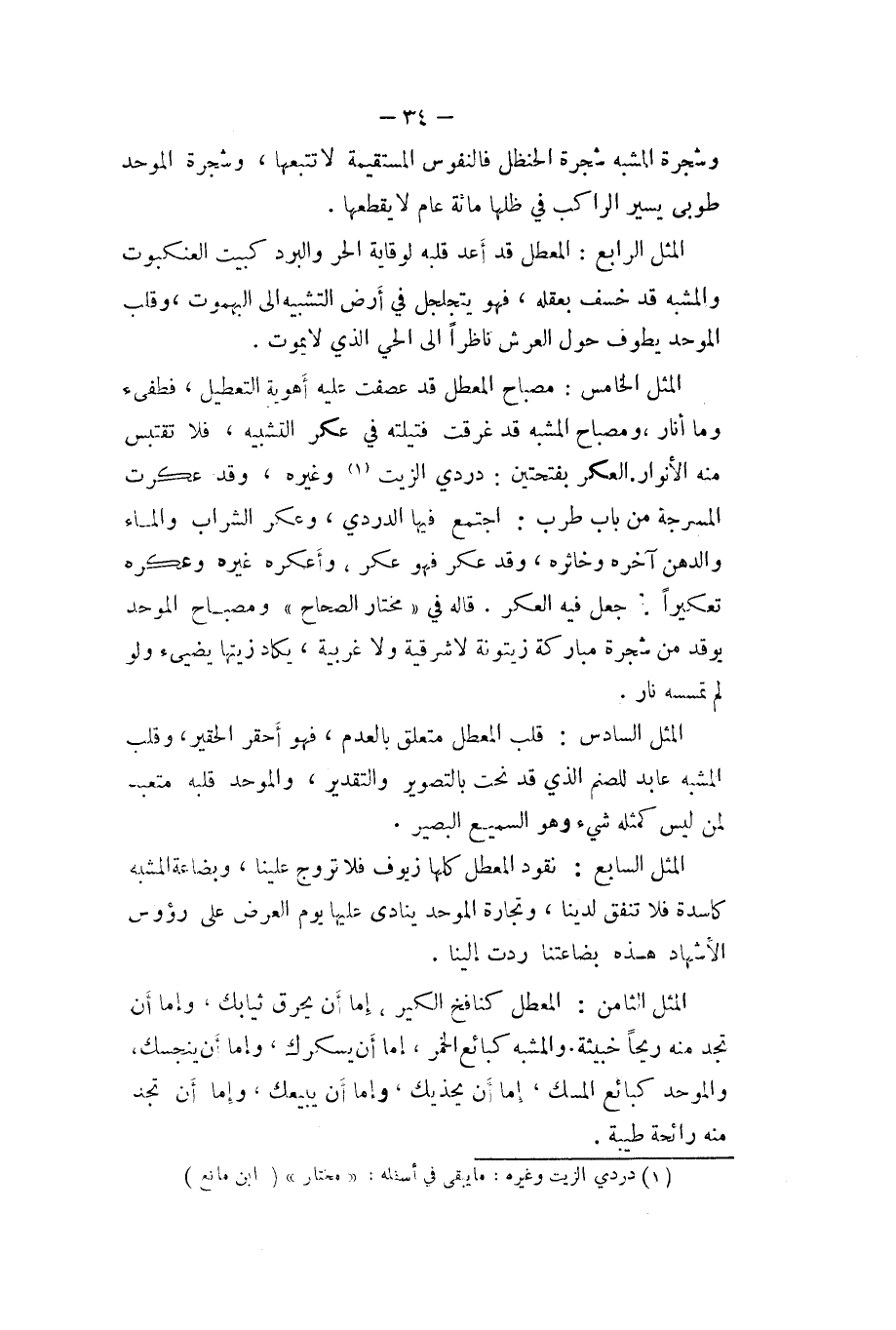 الْمثل الْخَامِس مِصْبَاح الْمُعَطل قد عصفت عَلَيْهِ أهوية التعطيل فطفئ وَمَا أنار ومصباح الْمُشبه قد غرقت فتيلته فِي عكر التَّشْبِيه فَلَا تقتبس مِنْهُ الْأَنْوَار العكر بِفتْحَتَيْنِ دردي الزَّيْت وَغَيره وَقد عكرت المسرجة من بَاب طرب اجْتمع فِيهَا الدردي وعكر الشَّرَاب وَالْمَاء والدهن آخِره خاثره وَقد عكر فَهُوَ عكر وأعكره غَيره وعكره تعكيرا جعل فِيهِ العكر قَالَه فِي (مُخْتَار الصِّحَاح (ومصباح الموحد يرقد من شَجَرَة مباركة زيتونة لَا شرقية وَلَا غربية يكَاد زيتها يضيئ وَلَو لم تمسسه نَار