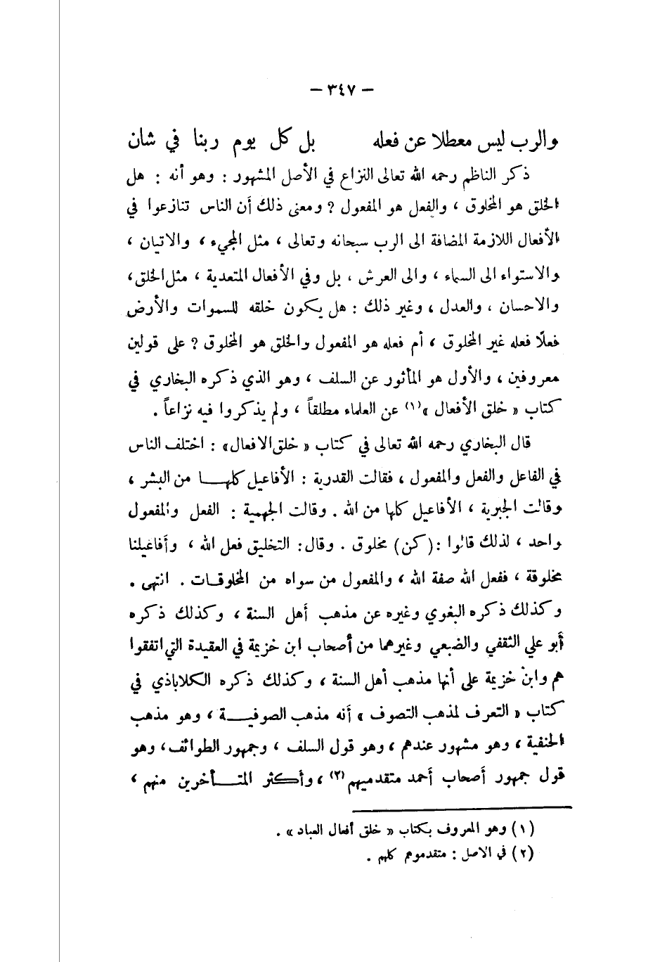 قَالَ البُخَارِيّ رَحمَه الله تَعَالَى فِي كتاب (خلق الافعال (اخْتلف النَّاس فِي الْفَاعِل وَالْفِعْل وَالْمَفْعُول فَقَالَت الْقَدَرِيَّة الافاعيل كلهَا من الْبشر وَقَالَت الجبرية الافاعيل كلهَا من الله وَقَالَت الْجَهْمِية الْفِعْل وَالْمَفْعُول وَاحِد لذَلِك قَالُوا (كن) مَخْلُوق وَقَالَ التخليق فعل الله وأفاعيلنا مخلوقة فَفعل الله صفة الله وَالْمَفْعُول من سواهُ من الْمَخْلُوقَات انْتهى وَكَذَلِكَ ذكره الْبَغَوِيّ وَغَيره عَن مَذْهَب أهل السّنة وَكَذَلِكَ ذكره أَبُو عَليّ الثَّقَفِيّ والضبعي وَغَيرهمَا من أَصْحَاب ابْن خُزَيْمَة فِي العقيدة الَّتِي اتَّفقُوا هم وَابْن خُزَيْمَة على أَنَّهَا مَذْهَب أهل السّنة وَكَذَلِكَ ذكره الكلاباذي فِي كتاب (التعرف لمَذْهَب التصوف (أَنه مَذْهَب الصُّوفِيَّة وَهُوَ مَذْهَب الْحَنَفِيَّة وَهُوَ مَشْهُور عِنْدهم وَهُوَ قَول السّلف وَجُمْهُور الطوائف وَهُوَ قَول جُمْهُور أَصْحَاب أَحْمد متقدميهم وَأكْثر الْمُتَأَخِّرين مِنْهُم