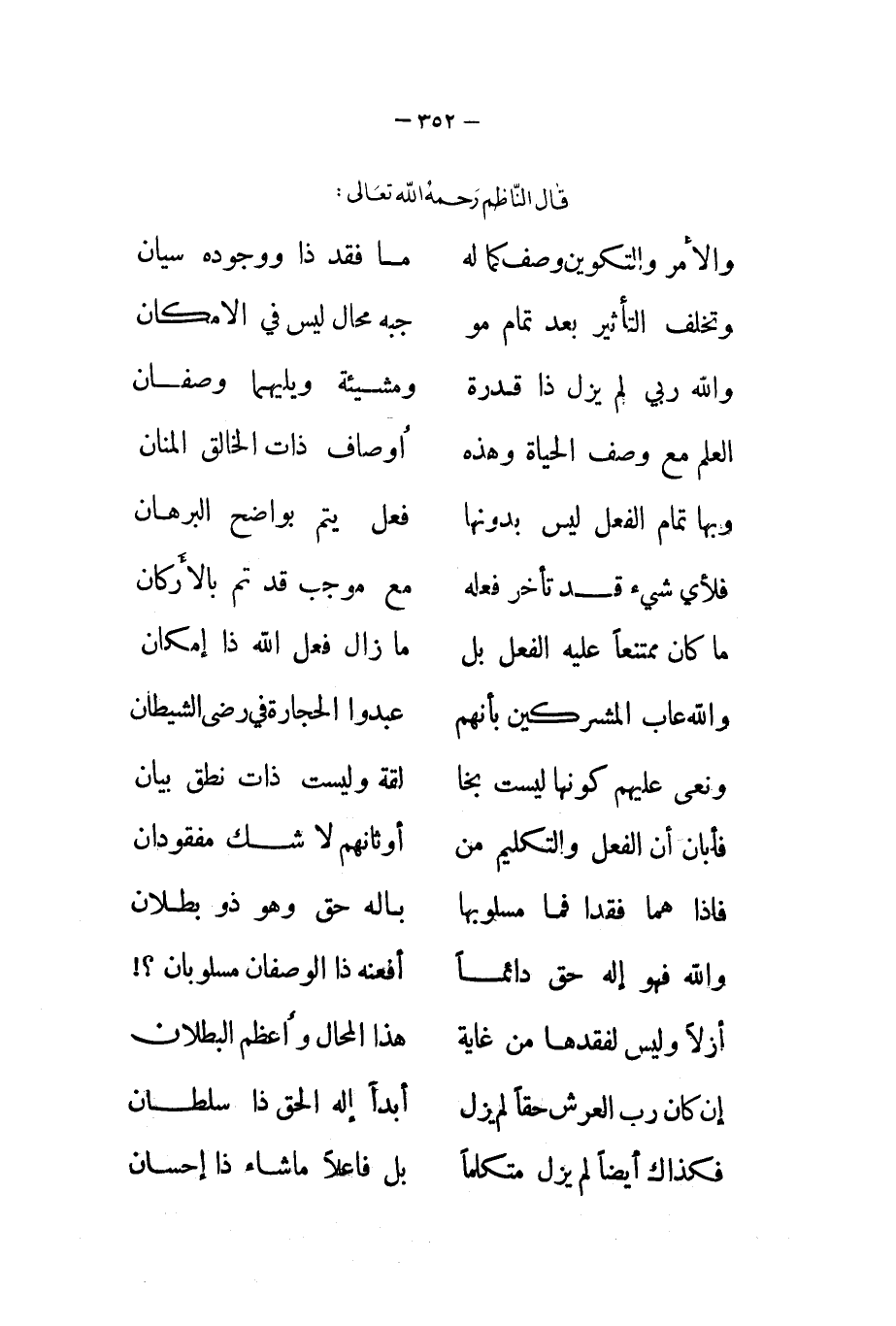 مَا كَانَ مُمْتَنعا عَلَيْهِ الْفِعْل بل ... مَا زَالَ فعل الله ذَا إِمْكَان 5 ... وَالله عَابَ الْمُشْركين بِأَنَّهُم ... عبدُوا الْحِجَارَة فِي رضى الشَّيْطَان 5 ... ونعى عَلَيْهِم كَونهَا لَيست بخا