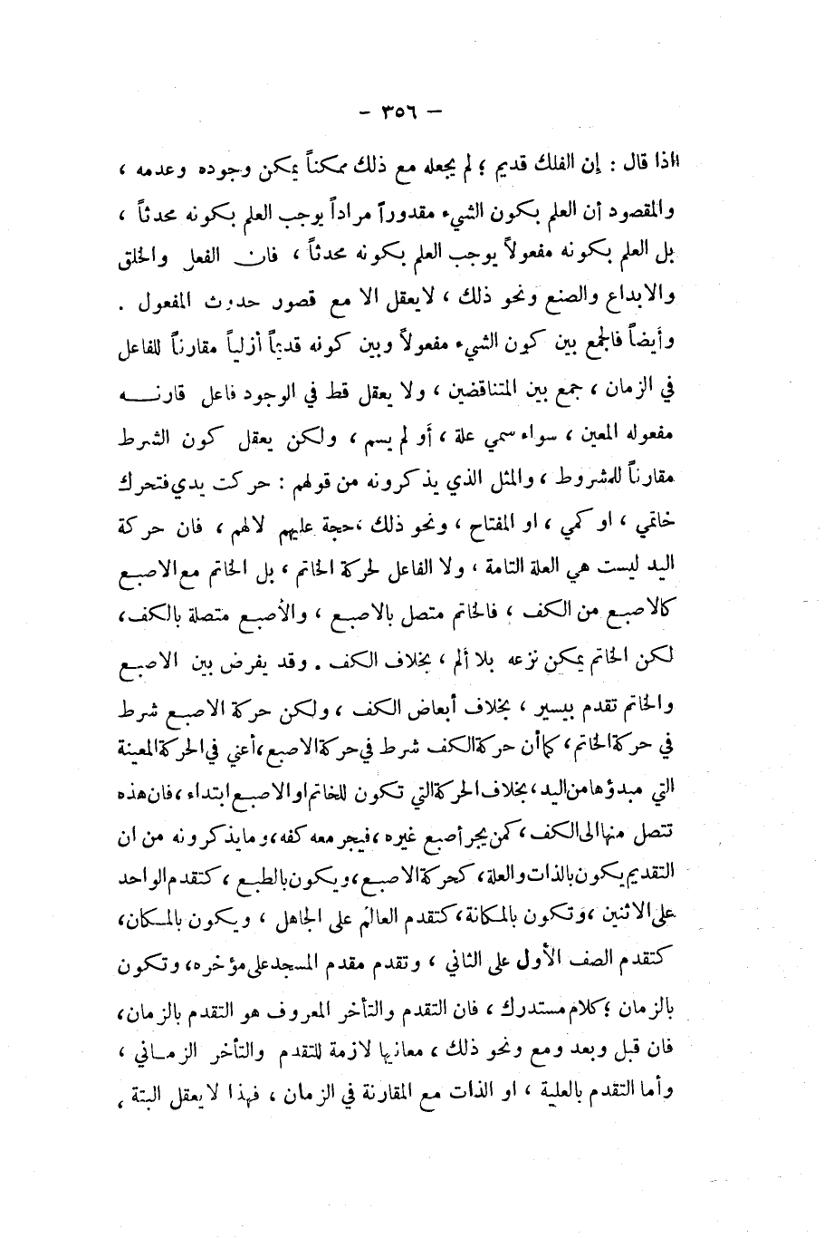 إِذا قَالَ إِن الْفلك قديم لم يَجعله مَعَ ذَلِك مُمكنا يُمكن وجوده وَعَدَمه وَالْمَقْصُود ان الْعلم بِكَوْن الشيئ مَقْدُورًا مرَادا يُوجب الْعلم بِكَوْنِهِ مُحدثا بل الْعلم بِكَوْنِهِ مَفْعُولا يُوجب الْعلم بِكَوْنِهِ مُحدثا فَأن الْفِعْل والخلق والإبداع والصنع وَنَحْو ذَلِك لَا يعقل إِلَّا مَعَ قُصُور حُدُوث الْمَفْعُول وَأَيْضًا فالجمع بَين كَون الشَّيْء مَفْعُولا وَبَين كَونه قَدِيما أزليا مُقَارنًا للْفَاعِل فِي الزَّمَان جمع بَين المتناقضين وَلَا يعقل قطّ فِي الْوُجُود فَاعل قارنه مَفْعُوله الْمعِين سَوَاء سمي عِلّة أَو لَو يسم وَلَكِن يعقل كَون الشَّرْط مُقَارنًا للمشروط والمثل الَّذِي يذكرُونَهُ من قَوْلهم حركت يَدي فَتحَرك خَاتمِي أَو كمي أَو الْمِفْتَاح وَنَحْو ذَلِك حجَّة عَلَيْهِم لَا لَهُم فَإِن حَرَكَة الْيَد لَيست هِيَ الْعلَّة التَّامَّة وَلَا الْفَاعِل لحركة الْخَاتم بل الْخَاتم مَعَ الْأصْبع كالإصبع من الْكَفّ فالخاتم مُتَّصِل بالإصبع والإصبع مُتَّصِلَة بالكف لَكِن الْخَاتم يُمكن نَزعه بِلَا ألم بِخِلَاف الْكَفّ وَقد يفْرض بَين الْأصْبع والخاتم تقدم بِيَسِير بِخِلَاف أبعاض الْكَفّ وَلَكِن حَرَكَة الإصبع شَرط فِي حَرَكَة الْخَاتم كَمَا أَن حَرَكَة الْكَفّ شَرط فِي حَرَكَة الإصبع أَعنِي فِي الْحَرَكَة الْمعينَة الَّتِي مبدؤها من الْيَد بِخِلَاف الْحَرَكَة الَّتِي تكون للخاتم أَو الاصبع إبتداء فَإِن هَذِه تتصل مِنْهَا إِلَى الْكَفّ كمن يجر أصْبع غَيره فيجر مَعَه كَفه وَمَا يذكرُونَهُ من أَن التَّقْدِيم يكون بِالذَّاتِ وَالْعلَّة كحركة الاصبع وَيكون بالطبع كتقدم الْوَاحِد على الِاثْنَيْنِ وَتَكون بالمكانة كتقدم الْعَالم على الجاهويكون بِالْمَكَانِ كتقدم الصَّفّ الأول على الثَّانِي وَتقدم مقدم الْمَسْجِد على مؤخره وَتَكون بِالزَّمَانِ كَلَام مُسْتَدْرك فَإِن التَّقَدُّم والتأخر الْمَعْرُوف هُوَ التَّقَدُّم بِالزَّمَانِ فَإِن قبل وَبعد وَمَعَ وَنَحْو ذَلِك مَعَانِيهَا لَازِمَة لتقدم والتأخر الزماني وَأما التَّقَدُّم بالعلية أَو الذَّات مَعَ الْمُقَارنَة فِي الزَّمَان فَهَذَا لَا يعقل الْبَتَّةَ