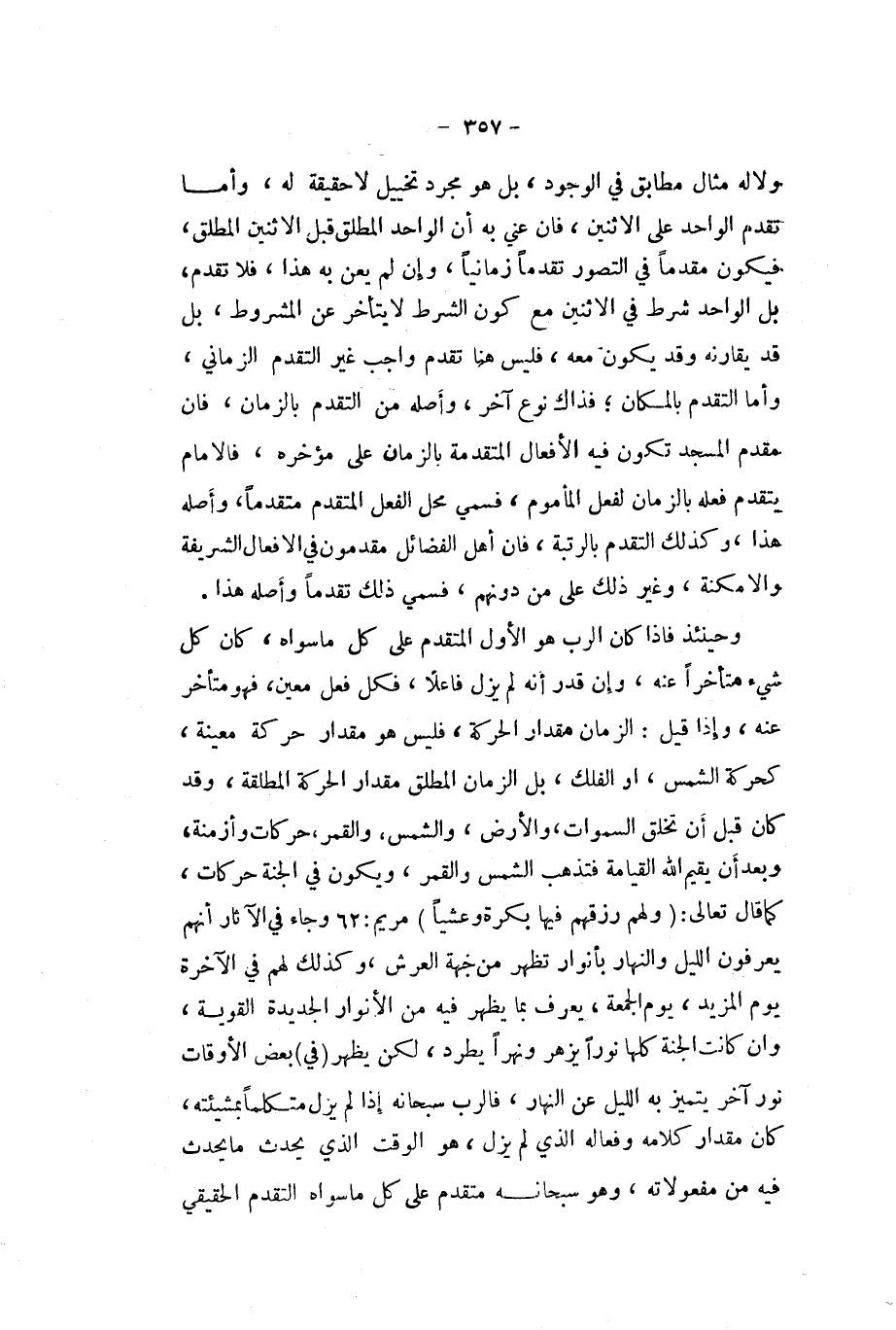 وَحِينَئِذٍ فَإِذا كَانَ الرب هُوَ الأول الْمُتَقَدّم على كل مَا سواهُ كَانَ كل شيئ مُتَأَخِّرًا عَنهُ وَإِن قدر أَنه لم يزل فَاعِلا فَكل فعل معِين فَهُوَ مُتَأَخّر عَنهُ وَإِذا قيل الزَّمَان مِقْدَار الْحَرَكَة فَلَيْسَ هُوَ مِقْدَار حَرَكَة مُعينَة كحركة الشَّمْس أَو الْفلك بل الزَّمَان الْمُطلق مِقْدَار الْحَرَكَة الْمُطلقَة وَقد كَانَ قبل أَن تخلق السَّمَوَات وَالْأَرْض وَالشَّمْس وَالْقَمَر حركات وأزمنة وَبعد أَن يُقيم الله الْقِيَامَة ت فتذهب الشَّمْس وَالْقَمَر وَيكون فِي الْجنَّة حركات كَمَا قَالَ تَعَالَى {وَلَهُم رزقهم فِيهَا بكرَة وعشيا} مَرْيَم 62 وَجَاء فِي الْآثَار أَنهم يعْرفُونَ اللَّيْل وَالنَّهَار بأنوار تظهر من جِهَة الْعَرْش وَكَذَلِكَ لَهُم فِي الْآخِرَة يَوْم الْمَزِيد يَوْم الْجُمُعَة يعرف بِمَا يظْهر فِيهِ من الْأَنْوَار الجديدة القوية وَإِن كَانَت الْجنَّة كلهَا نورا يزهر ونهرا يطرد لَكِن يظْهر (فِي) بعض الْأَوْقَات نورا آخر يتَمَيَّز بِهِ اللَّيْل عَن النَّهَار فالرب سُبْحَانَهُ إِذا لم يزل متكلما بمشيئته كَانَ مِقْدَار كَلَامه وفعاله الَّذِي لم يزل هُوَ الْوَقْت الَّذِي يحدث مَا يحدث فِيهِ من مفعولاته وَهُوَ سُبْحَانَهُ مُتَقَدم على كل مَا سواهُ التَّقَدُّم الحقي
