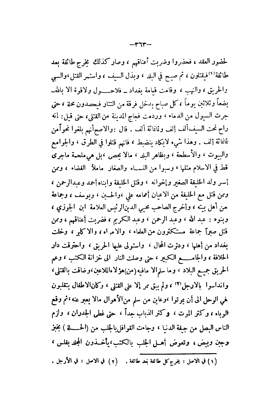 لحضور العقد فحضرو اوضربت أَعْنَاقهم وَصَارَ كَذَلِك يخرج طَائِفَة بعد طَائِفَة فيقتلون ثمَّ صِيحَ فِي الْبَلَد وبذل السَّيْف وَاسْتمرّ الْقَتْل والسبي والحريق والنهب وَقَامَت قِيَامَة بَغْدَاد فَلَا حول وَلَا قُوَّة الا بِاللَّه بضعا وَثَلَاثِينَ يَوْمًا كل صباح يدْخل فرقة من التتار فيحصدون محلّة حَتَّى جرت السُّيُول من الدِّمَاء وردمت فجاج الْمَدِينَة من الْقَتْلَى حَتَّى قيل إِنَّه رَاح تَحت السَّيْف ألف ألف وَثَمَانمِائَة ألف قَالَ والاصح أَنهم بلغُوا نَحوا من ثَمَانمِائَة ألف وَهَذَا شَيْء لَا يكَاد يَنْضَبِط فَإِنَّهُم قتلوا فِي الطّرق والجوامع والبيوت والاسطحة وبظاهر الْبَلَد مَا لَا يُحْصى بل هِيَ ملحمة مَا جرى قطّ فِي الاسلام مثلهَا وَسبوا من النِّسَاء وَالصغَار مَا مَلأ الفضاء وَمِمَّنْ أسر ولد الْخَلِيفَة الصَّغِير وإخوانه وَقتل الْخَلِيفَة وابناه أَحْمد وَعبد الرَّحْمَن وَمِمَّنْ قتل مَعَ الْخَلِيفَة من الاعيان أَعْمَامه عَليّ وَالْحُسَيْن ويوسف وَجَمَاعَة من أهل بَيته وَأخرج الصاحب محيي الدّين الرئيس الْعَلامَة ابْن الْجَوْزِيّ وَبَنوهُ عبد الله وَعبد الرَّحْمَن وَعبد الْكَرِيم فَضربت أَعْنَاقهم وَمِمَّنْ قتل صبرا جمَاعَة مستكثرون من الْعلمَاء والامراء والاكابر وخلت بَغْدَاد من أَهلهَا ودثرت الْمحَال وَاسْتولى عَلَيْهَا الْحَرِيق واحترقت دَار الْخلَافَة وَالْجَامِع الْكَبِير حَتَّى وصلت النَّار الى خزانَة الْكتب وَعم الْحَرِيق جَمِيع الْبِلَاد وَمَا سلم الا مَا فِيهِ (من) هَؤُلَاءِ الملاعين وَضَاقَتْ بالقتلى وانداسوا بالارجل وَلم يبْق ممر الا على الْقَتْلَى وَكَانَ الاطفال يَتَقَلَّبُونَ فِي الوحل الى أَن يموتوا وعاين من سلم من الاهوال مَا لَا يعبر عَنهُ ثمَّ وَقع الوباء وَكثر الْمَوْت وَكثر الذُّبَاب جدا حَتَّى غطى الجدران وَلزِمَ النَّاس البصل من جيفة الدُّنْيَا وَجَاءَت القوافل بالجلب من (الْحلَّة) بِخبْز وَجبن وبيض وتعوض أهل الجلب بالكتب يَأْخُذُونَ المجلد بفلس