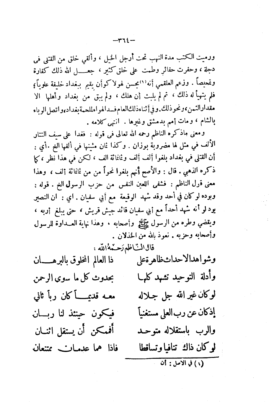 وَمعنى مَا ذكره النَّاظِم رَحمَه الله تَعَالَى فِي قَوْله فغدا على سيف التتار الالف فِي مثل لَهَا مَضْرُوبَة بوزان وَكَذَا ثَمَان مئينها فِي ألفها الخ أَي أَن الْقَتْلَى فِي بَغْدَاد بلغُوا ألف ألف وَثَمَانمِائَة الف لَكِن فِي هَذَا نظر كَمَا ذكره الذَّهَبِيّ قَالَ والاصح أَنهم بلغُوا نَحوا من ثَمَانمِائَة ألف وَهَذَا معنى قَول النَّاظِم فشفى اللعين النَّفس من حزب الرَّسُول الخ قَوْله وبوده لَو كَانَ فِي اُحْدُ وَقد شهد الوقيعة مَعَ أبي سُفْيَان أَي ان النصير يود لَو أَنه شهد أحدا مَعَ أبي سُفْيَان قَائِد جَيش قُرَيْش حَتَّى يبلغ اربه وَيَقْضِي وطره من الرَّسُول صلى الله عَلَيْهِ وَسلم واصحابه وَهَذَا نِهَايَة الْعَدَاوَة للرسول وَأَصْحَابه وَحزبه نَعُوذ بِاللَّه من الخذلان