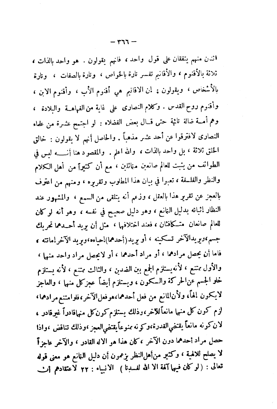 اثْنَان مِنْهُم يتفقان على قَول وَاحِد فانهم يَقُولُونَ هُوَ وَاحِد بِالذَّاتِ ثَلَاثَة بالاقنوم والاقانيم تفسر تَارَة بالخواص وَتارَة بِالصِّفَاتِ وَتارَة بالاشخاص وَيَقُولُونَ إِن الاقانيم هِيَ أقنوم الاب وأقنوم الابْن وأقنوم روح الْقُدس وَكَلَام النَّصَارَى على غَايَة من الفهاهة والبلادة وهم أمة ضَالَّة تائهة حَتَّى قَالَ بعض الْفُضَلَاء لَو اجْتمع عشرَة من عُلَمَاء النَّصَارَى لَا فترقوا عَن أحد عشر مذهبا وَالْحَاصِل أَنهم لَا يَقُولُونَ خَالق الْخلق ثَلَاثَة بل وَاحِد بِالذَّاتِ وَالله اعْلَم وَالْمَقْصُود هُنَا أَنه لَيْسَ فِي الطوائف من يثبت للْعَالم صانعين متماثلين مَعَ أَن كثيرا من أهل الْكَلَام وَالنَّظَر والفلسفة تعبوا فِي بَيَان هَذَا الْمَطْلُوب وَتَقْرِيره وَمِنْهُم من اعْترف بِالْعَجزِ عَن تَقْرِير هَذَا بِالْعقلِ وَزعم أَنه يتلَقَّى من السّمع وَالْمَشْهُور عِنْد النظار إثْبَاته بِدَلِيل التمانع وَهُوَ دَلِيل صَحِيح فِي نَفسه وَهُوَ أَنه لَو كَانَ للْعَالم صانعان متكافئان فَعِنْدَ اخْتِلَافهمَا مثل أَن يُرِيد أَحدهمَا تَحْرِيك جسم وَيُرِيد الآخر تسكينه أَو يُرِيد (أَحدهمَا) إحياءه وَيُرِيد الاخر إماتته فاما أَن يحصل مرادهما اَوْ مُرَاد أَحدهمَا اَوْ لَا يحصل مُرَاد وَاحِد مِنْهُمَا والاول مُمْتَنع لانه يسْتَلْزم الْجمع بَين الضدين وَالثَّالِث مُمْتَنع لِأَنَّهُ يسْتَلْزم خلو الْجِسْم عَن الْحَرَكَة والسكون ويستلزم أَيْضا عجز كل مِنْهُمَا وَالْعَاجِز لَا يكون إِلَهًا ولان الْمَانِع من فعل أَحدهمَا هُوَ فعل الاخر فَلَو امْتنع مرادهما لزم كَون كل مِنْهُمَا مَانِعا للْآخر وَذَلِكَ يسْتَلْزم كَون كل مِنْهُمَا قَادِرًا غير قَادر لَان كَونه مَانِعا يَقْتَضِي الْقُدْرَة وَكَونه مَمْنُوعًا يَقْتَضِي الْعَجز وَذَلِكَ تنَاقض واذا حصل مُرَاد أَحدهمَا دون الاخر كَانَ هَذَا هُوَ الاله الْقَادِر وَالْآخر عَاجِزا لَا يصلح للالهية وَكثير من أهل النّظر يَزْعمُونَ أَن دَلِيل التمانع هُوَ معنى قَوْله تَعَالَى {لَو كَانَ فيهمَا آلِهَة إِلَّا الله لفسدتا} الانبياء 22 لاعتقادهم أَن