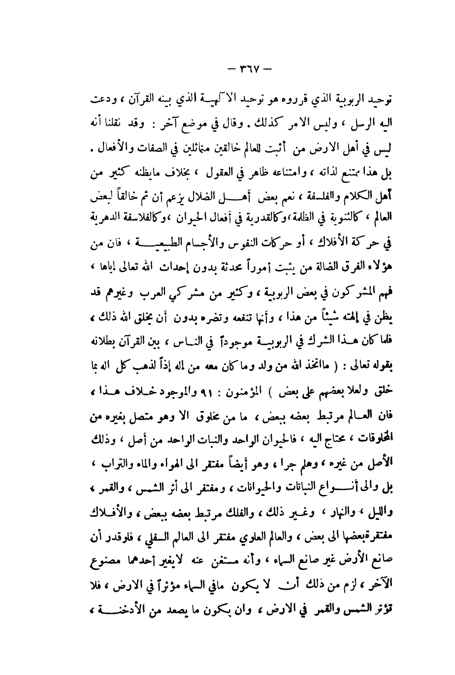 تَوْحِيد الربوبية الَّذِي قرروه هُوَ تَوْحِيد الالهية الَّذِي بَينه الْقُرْآن ودعت اليه الرُّسُل وَلَيْسَ الامر كَذَلِك وَقَالَ فِي مَوضِع آخر وَقد نقلنا أَنه لَيْسَ فِي أهل الارض من أثبت للْعَالم خالقين متماثلين فِي الصِّفَات والافعال بل هَذَا مُمْتَنع لذاته وامتناعه ظَاهر فِي الْعُقُول بِخِلَاف مَا يَظُنّهُ كثير من أهل الْكَلَام والفلسفة نعم بعض أهل الضلال يزْعم أَن ثمَّ خَالِقًا لبَعض الْعَالم كالثنوية فِي الظلمَة وكالقدرية فِي أَفعَال الْحَيَوَان وكالفلاسفة الدهرية فِي حَرَكَة الافلاك اَوْ حركات النُّفُوس والاجسام الطبيعية فان من هَؤُلَاءِ الْفرق الضَّالة من يثبت امورا محدثة بِدُونِ إِحْدَاث الله تَعَالَى إِيَّاهَا فهم الْمُشْركُونَ فِي بعض الربوبية وَكثير من مُشْركي الْعَرَب وَغَيرهم قد يظنّ فِي إلهته شَيْئا من هَذَا وَأَنَّهَا تَنْفَعهُ وتضره بِدُونِ أَن يخلق الله ذَلِك فَلَمَّا كَانَ هَذَا الشّرك فِي الربوبية مَوْجُودا فِي النَّاس بَين الْقُرْآن بُطْلَانه بقوله تَعَالَى {مَا اتخذ الله من ولد وَمَا كَانَ مَعَه من إِلَه إِذا لذهب كل إِلَه بِمَا خلق ولعلا بَعضهم على بعض} الْمُؤْمِنُونَ 91 وَالْمَوْجُود خلاف هَذَا فَإِن الْعَالم مُرْتَبِط بعضه بِبَعْض مَا من مَخْلُوق الا وَهُوَ مُتَّصِل بِغَيْرِهِ من الْمَخْلُوقَات مُحْتَاج اليه فالحيوان الْوَاحِد والنبات الْوَاحِد من أصل وَذَلِكَ الاصل من غَيره وهلم جرا وَهُوَ أَيْضا مفتقرا الى الْهَوَاء وَالْمَاء وَالتُّرَاب بل والى أَنْوَاع النباتات والحيوانات ومفتقر الى أثر الشَّمْس وَالْقَمَر وَاللَّيْل وَالنَّهَار وَغير ذَلِك والفلك مُرْتَبِط بعضه بِبَعْض والافلاك مفتقرة بَعْضهَا الى بعض والعالم الْعلوِي مفتقر الى الْعَالم السفلي فَلَو قدر ان صانع الارض غير صانع السَّمَاء وانه مستغن عَنهُ لَا يُغير أَحدهمَا مَصْنُوع الاخر لزم من ذَلِك أَن لَا يكون مَا فِي السَّمَاء مؤثرا فِي الارض فَلَا تُؤثر الشَّمْس وَالْقَمَر فِي الارض وان يكون مَا يصعد من الادخنة