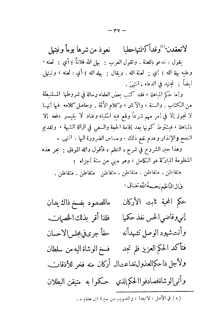 متغاعلن متفاعلن متفاعلن متفاعلن متفاعلن متفاعلن قَالَ النَّاظِم رَحمَه الله تَعَالَى ... حكم الْمحبَّة ثَابت الْأَركان
