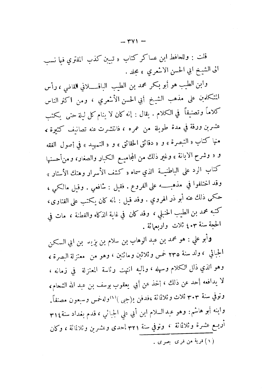 قلت وللحافظ ابْن عَسَاكِر كتاب (تَبْيِين كذب المفتري فِيمَا نسب الى الشَّيْخ ابي الْحسن الاشعري (مُجَلد