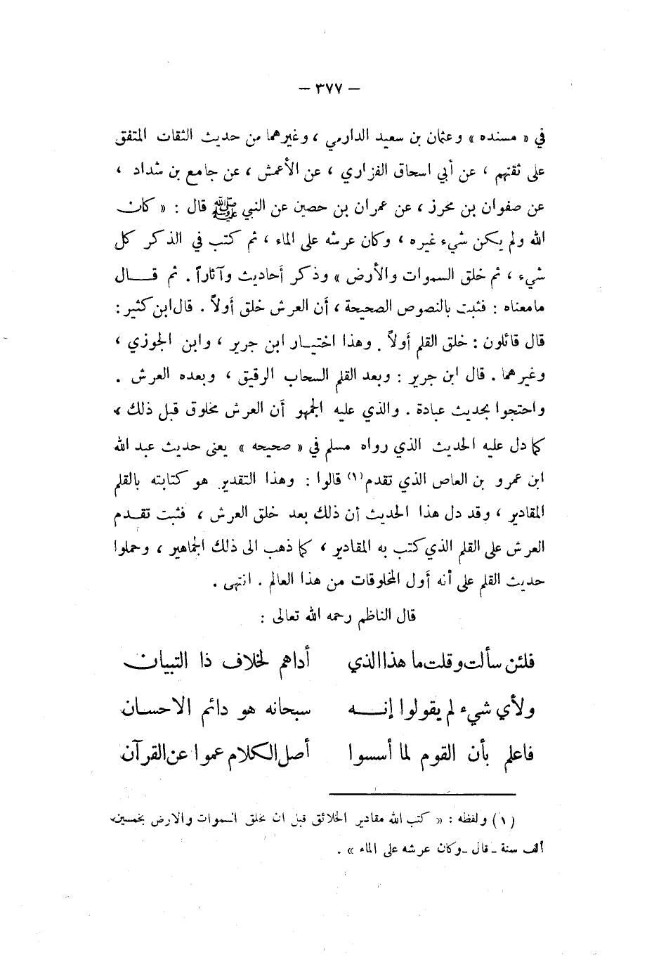 فِي (مُسْنده (وَعُثْمَان بن سعيد الدِّرَامِي وَغَيرهمَا من حَدِيث الثِّقَات الْمُتَّفق على ثقتهم عَن أبي إِسْحَاق الْفَزارِيّ عَن الْأَعْمَش عَن جَامع بن شَدَّاد عَن صَفْوَان بن مُحرز عَن عمرَان بن حُصَيْن عَن النَّبِي صلى الله عَلَيْهِ وَسلم قَالَ (كَانَ الله وَلم يكن شيئ غَيره وَكَانَ عَرْشه على المَاء ثمَّ كتب فِي الذّكر كل شيئ ثمَّ خلق السَّمَوَات وَالْأَرْض (وَذكر أَحَادِيث وآثارا ثمَّ قَالَ مَا مَعْنَاهُ فَثَبت بالنصوص الصَّحِيحَة أَن الْعَرْش خلق أَولا قَالَ ابْن كثير قَالَ قَائِلُونَ خلق الْقَلَم أَولا وَهَذَا اخْتِيَار ابْن جرير وَابْن الْجَوْزِيّ وَغَيرهمَا قَالَ ابْن جرير وَبعد الْقَلَم السَّحَاب الرَّقِيق وَبعده الْعَرْش وَاحْتَجُّوا بِحَدِيث عبَادَة وَالَّذِي عَلَيْهِ الْجُمْهُور أَن الْعَرْش مَخْلُوق قبل ذلأك كَمَا دلّ عَلَيْهِ الحَدِيث الَّذِي رَوَاهُ مُسلم فِي (صَحِيحه (يَعْنِي حَدِيث عبد الله ابْن عَمْرو بن الْعَاصِ الَّذِي تقدم قَالُوا وَهَذَا التَّقْدِير هُوَ كِتَابه بالقلم الْمَقَادِير وَقد دلّ هَذَا الحَدِيث ان ذَلِك بعد خلق الْعَرْش فَثَبت تقدم الْعَرْش على الْقَلَم الَّذِي كتب بِهِ الْمَقَادِير كَمَا ذهب إِلَى ذَلِك الجماهير وحملوا حَدِيث الْقَلَم على أَنه أول الْمَخْلُوقَات من هَذَا الْعَالم انْتهى