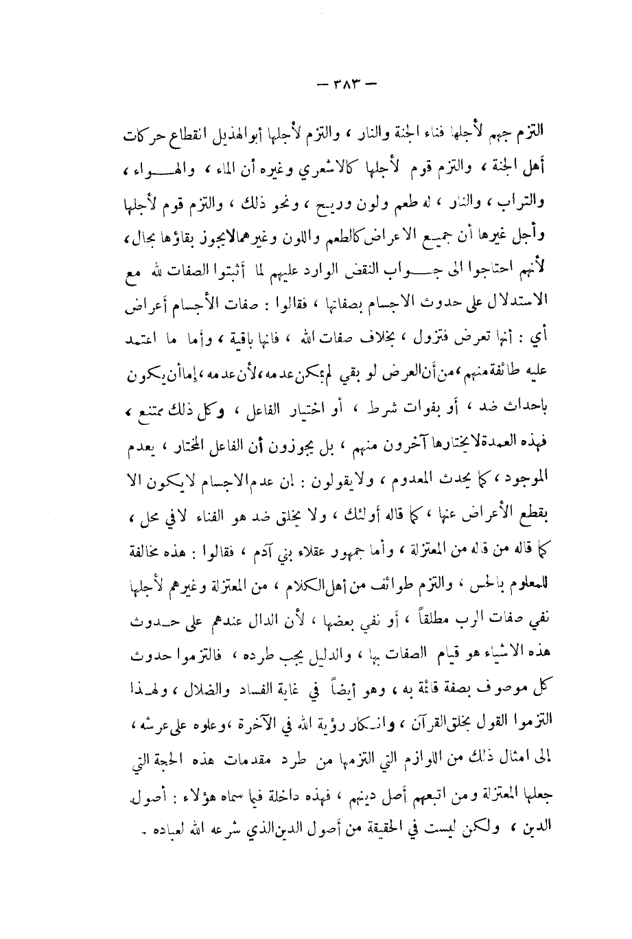 الْتزم جهم لاجلها فنَاء الْجنَّة وَالنَّار وَالْتزم لاجلها أَبُو الْهُذيْل انْقِطَاع حركات أهل الْجنَّة وَالْتزم قوم لاجلها كالاشعري وَغَيره ان المَاء والهواء وَالتُّرَاب وَالنَّار لَهُ طعم ولون وريح وَنَحْو ذَلِك وَالْتزم قوم لاجلها وَأجل غَيرهَا ان جَمِيع الاعراض كالطعم واللون وَغَيرهمَا لَا يجوز بَقَاؤُهَا بِحَال لإنهم احتاجوا الى جَوَاب النَّقْض الْوَارِد عَلَيْهِم لما أثبتوا الصِّفَات لله مَعَ الِاسْتِدْلَال على حُدُوث الاجسام بصفاتها فَقَالُوا صِفَات الاجسام أَعْرَاض أَي انها تعرض فتزول بِخِلَاف صِفَات الله فانها بَاقِيَة وَأما مَا اعْتمد عَلَيْهِ طَائِفَة مِنْهُم من أَن الْعرض لَو بَقِي لم يُمكن عَدمه لَان عَدمه إِمَّا أَن يكون باحداث ضد أَو بِفَوَات شَرط اَوْ اخْتِيَار الْفَاعِل وكل ذَلِك مُمْتَنع فَهَذِهِ الْعُمْدَة لَا يختارها آخَرُونَ مِنْهُم بل يجوزون أَن الْفَاعِل الْمُخْتَار بِعَدَمِ الْمَوْجُود كَمَا يحث الْمَعْدُوم وَلَا يَقُولُونَ إِن عدم الاجسام لَا يكون الا بِقطع الاعراض عَنْهَا كَمَا قَالَه أُولَئِكَ وَلَا يخلق ضد هُوَ الفناء لافي مَحل كَمَا قَالَه من قَالَه من الْمُعْتَزلَة وَأما جُمْهُور عقلاء بني آدم فَقَالُوا هَذِه مُخَالفَة للمعلوم بالحس وَالْتزم طوائف من أهل الْكَلَام من الْمُعْتَزلَة وَغَيرهم لأَجلهَا نفي صِفَات الرب مُطلقًا أَو نفي بَعْضهَا لِأَن الدَّال عِنْدهم على حُدُوث هَذِه الاشياء هُوَ قيام الصِّفَات بهَا وَالدَّلِيل يجب طرده فالتزموا حُدُوث كل مَوْصُوف بِصفة قَائِمَة بِهِ وَهُوَ ايضا فِي غَايَة الْفساد والضلال وَلِهَذَا التزموا القَوْل بِخلق الْقُرْآن وانكار رُؤْيَة الله فِي الْآخِرَة وعلوه على عَرْشه الى امثال ذَلِك من اللوازم الَّتِي التزمها من طرد مُقَدمَات هَذِه الْحجَّة الَّتِي جعلهَا الْمُعْتَزلَة وَمن اتبعهم أصل دينهم فَهَذِهِ دَاخِلَة فِيمَا سَمَّاهُ هَؤُلَاءِ أصُول الدّين وَلَكِن لَيست فِي الْحَقِيقَة من أصُول الدّين الَّذِي شَرعه الله لِعِبَادِهِ