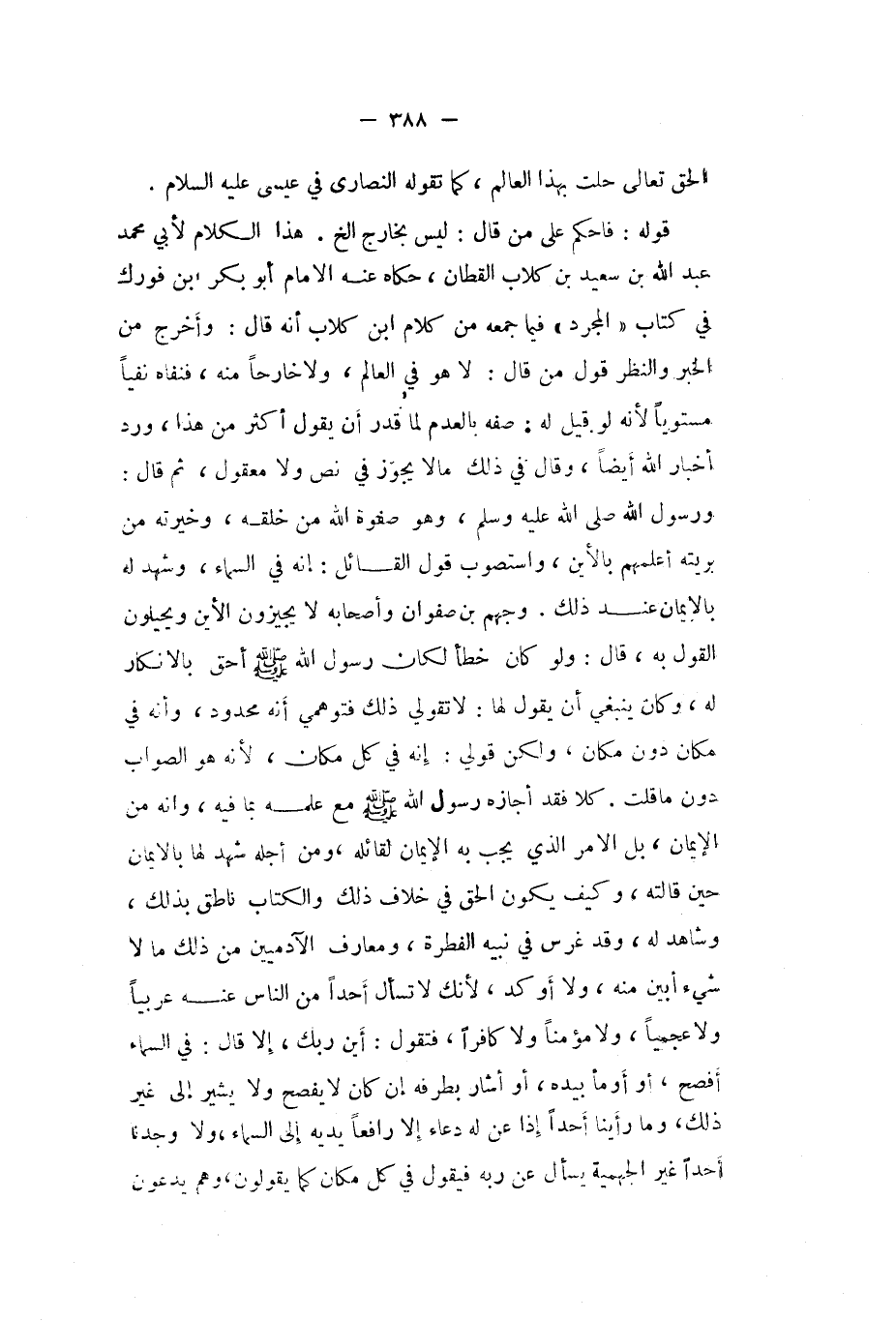 قَوْله فاحكم على من قَالَ لَيْسَ بِخَارِج الخ هَذَا الْكَلَام لابي مُحَمَّد عبد الله بن سعيد بن كلاب الْقطَّان حَكَاهُ عَنهُ الامام ابو بكر ابْن فورك فِي كتاب (الْمُجَرّد (فِيمَا جمعه من كَلَام ابْن كلاب أَنه قَالَ وَأخرج من الْخَبَر وَالنَّظَر قَول من قَالَ لَا هُوَ فِي الْعَالم وَلَا خَارِجا مِنْهُ فنفاه نفيا مستويا لانه لَو قيل لَهُ صفة بِالْعدمِ لما قدر أَن يَقُول أَكثر من هَذَا ورد أَخْبَار الله أَيْضا وَقَالَ فِي ذَلِك مَالا يجوز فِي نَص وَلَا مَعْقُول ثمَّ قَالَ وَرَسُول الله صلى الله عَلَيْهِ وَسلم وَهُوَ صفوة الله من خلقه وَخيرته من بريته أعلمهم بالاين واستصوب قَول الْقَائِل إِنَّه فِي السَّمَاء وَشهد لَهُ بالايمان عِنْد ذَلِك وجهم بن صَفْوَان وَأَصْحَابه لَا يجيزون الاين ويحيلون القَوْل بِهِ قَالَ وَلَو كَانَ خطأ لَكَانَ رَسُول الله صلى الله عَلَيْهِ وَسلم أَحَق بالانكار لَهُ وَكَانَ يَنْبَغِي أَن يَقُول لَهَا لَا تقولي ذَلِك فتوهمي أَنه مَحْدُود وَأَنه فِي مَكَان دون مَكَان وَلَكِن قولي إِنَّه فِي كل مَكَان لانه هُوَ الصَّوَاب دون مَا قلت كلا فقد أجَازه رَسُول الله صلى الله عَلَيْهِ وَسلم مَعَ علمه بِمَا فِيهِ وانه من الايمان بل الامر الَّذِي يجب بِهِ الايمان لقائله وَمن أَجله شهد لَهَا بالايمان حِين قالته وَكَيف يكون الْحق فِي خلاف ذَلِك وَالْكتاب نَاطِق بذلك وَشَاهد لَهُ وَقد غرس فِي نبيه الْفطْرَة ومعارف الْآدَمِيّين من ذَلِك مَا لَا شَيْء أبين مِنْهُ وَلَا أوكد لانك لَا تسْأَل أحدا من النَّاس عَنهُ عَرَبيا وَلَا عجميا وَلَا مُؤمنا وَلَا كَافِرًا فَتَقول أَيْن رَبك إِلَّا قَالَ فِي السَّمَاء أفْصح أَو أَوْمَأ بِيَدِهِ أَو أَشَارَ بطرفه إِن كَانَ لَا يفصح وَلَا يُشِير الى غير ذَلِك وَمَا رَأينَا أحدا إِذا عَن لَهُ دُعَاء الا رَافعا يَدَيْهِ إِلَى السَّمَاء وَلَا وجدنَا أحدا غير الْجَهْمِية يسْأَل عَن ربه فَيَقُول فِي كل مَكَان كَمَا يَقُولُونَ وهم يدعونَ