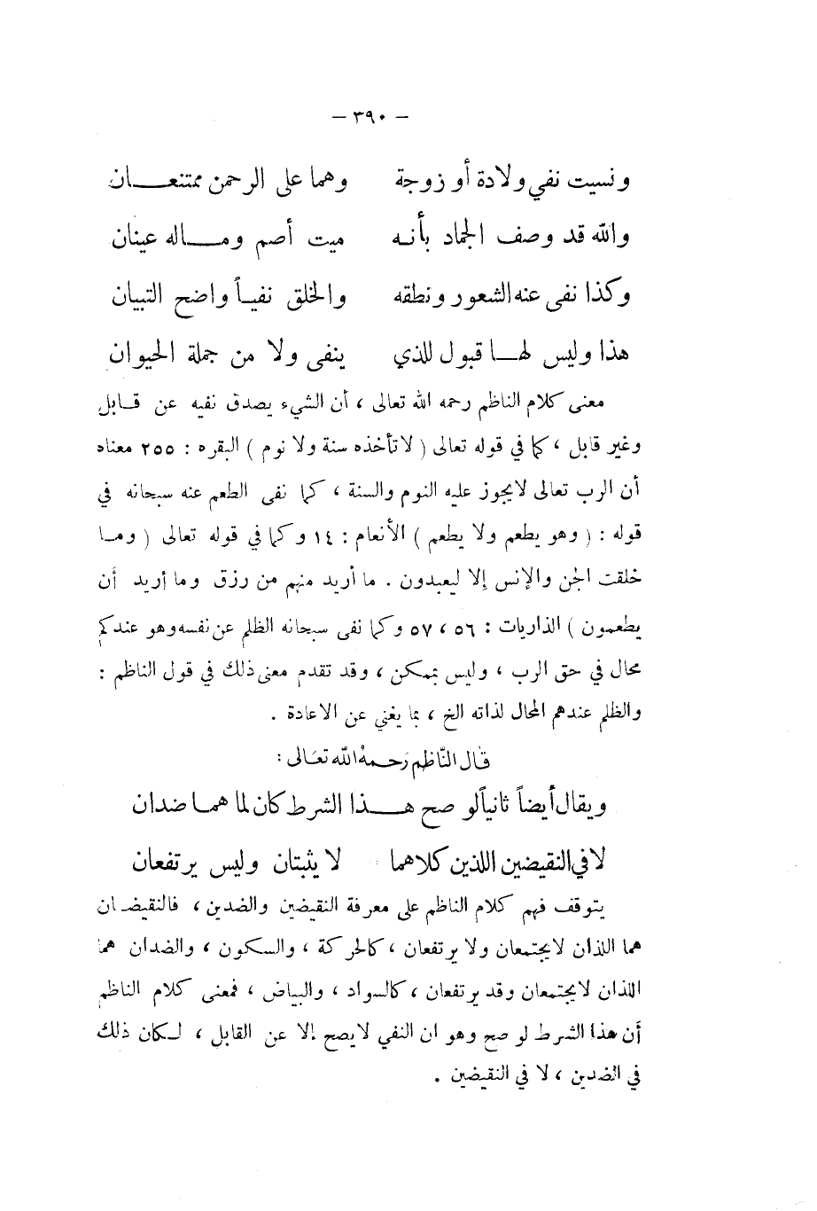 يتَوَقَّف فهم كَلَام النَّاظِم على معرفَة النقيضين والضدين فالنقيضان هما اللَّذَان لَا يَجْتَمِعَانِ وَلَا يرتفعان كالحركة والسكون والضدان هما اللَّذَان لَا يَجْتَمِعَانِ وَقد يرتفعان كالسواد وَالْبَيَاض فَمَعْنَى كَلَام النَّاظِم أَن هَذَا الشَّرْط لَو صَحَّ وَهُوَ ان النَّفْي لَا يَصح إِلَّا عَن الْقَابِل لَكَانَ ذَلِك فِي الضدين لَا فِي النقيضين