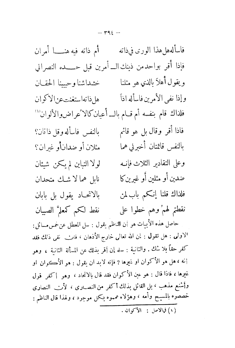 حَاصِل هَذِه الابيات هُوَ أَن النَّاظِم يَقُول سل الْمُعَطل عَن خمس مسَائِل الاولى هَل تَقول إِن الله تَعَالَى خَارج الاذهان فان نفى ذَلِك فقد كفر حَقًا بِلَا شكّ وَالثَّانيَِة سَله إِن أقرّ بذلك عَن الْمَسْأَلَة الثَّانِيَة وَهُوَ أَنه هَل هُوَ الاكوان اَوْ غَيرهَا فَإِنَّهُ لابد ان يَقُول هُوَ الاكوان اَوْ غَيرهَا فاذا قَالَ هُوَ عين الاكوان فقد قَالَ بالاتحاد وَهُوَ أكفر قَول واشنع مَذْهَب بل الْقَائِل بذلك أكفر من النَّصَارَى لَان النَّصَارَى خصصوه بالمسيح وَأمه وَهَؤُلَاء عمموه بِكُل مَوْجُود وَلِهَذَا قَالَ النَّاظِم