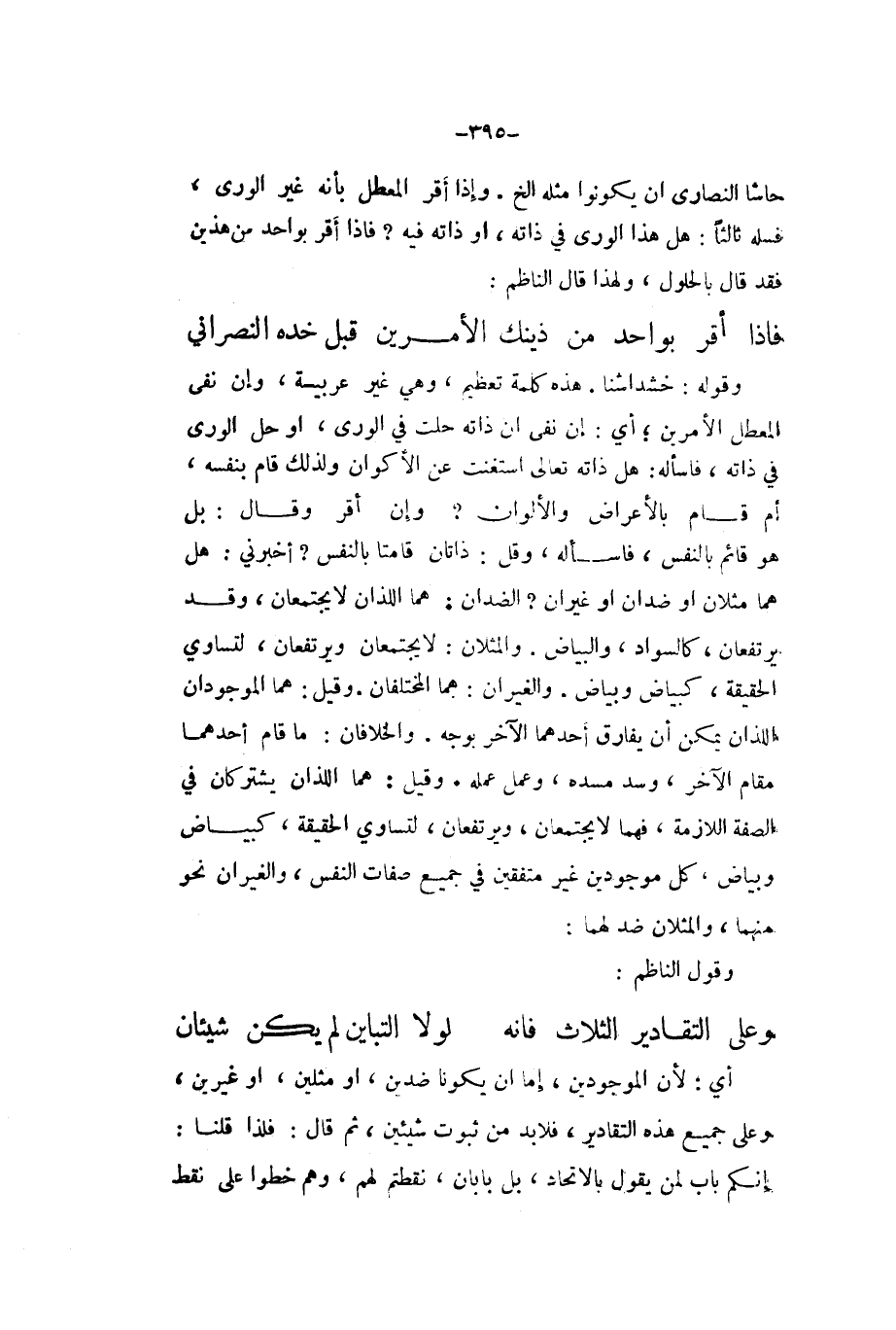 وَقَوله خشداشنا هَذِه كلمة تَعْظِيم وَهِي غير عَرَبِيَّة وَإِن نفى الْمُعَطل الامرين أَي أَن نفى ان ذَاته خلت فِي الورى اَوْ حل الورى فِي ذَاته فَاسْأَلْهُ هَل ذَاته تَعَالَى استغنت عَن الاكوان وَلذَلِك قَامَ بِنَفسِهِ ام قَامَ بالاعراض وَا لالوان وَإِن أقرّ وَقَالَ بل هُوَ قَائِم بِالنَّفسِ فَاسْأَلْهُ وَقل ذاتان قامتا بِالنَّفسِ أَخْبرنِي هَل هما مثلان اَوْ ضدان اَوْ غيران الضدان هما اللَّذَان لَا يَجْتَمِعَانِ وَقد يرتفعان كالسواد وَالْبَيَاض والمثلان لَا يَجْتَمِعَانِ ويرتفعان لتساوي الْحَقِيقَة كبياض وَبَيَاض والغيران هما المختلقان وَقيل هما الموجودان اللَّذَان يُمكن أَن يُفَارق أَحدهمَا الاخر بِوَجْه والخلافان مَا قَامَ أَحدهمَا مقَام الاخر وسد مسده وَعمل عمله وَقيل هما اللَّذَان يَشْتَرِكَانِ فِي الصّفة اللَّازِمَة فهما لَا يَجْتَمِعَانِ ويرتفعان لتساوي الْحَقِيقَة كبياض وَبَيَاض كل موجودين غير متفقين فِي جَمِيع صِفَات النَّفس والغيران نَحْو مِنْهُمَا والمثلان ضد لَهما