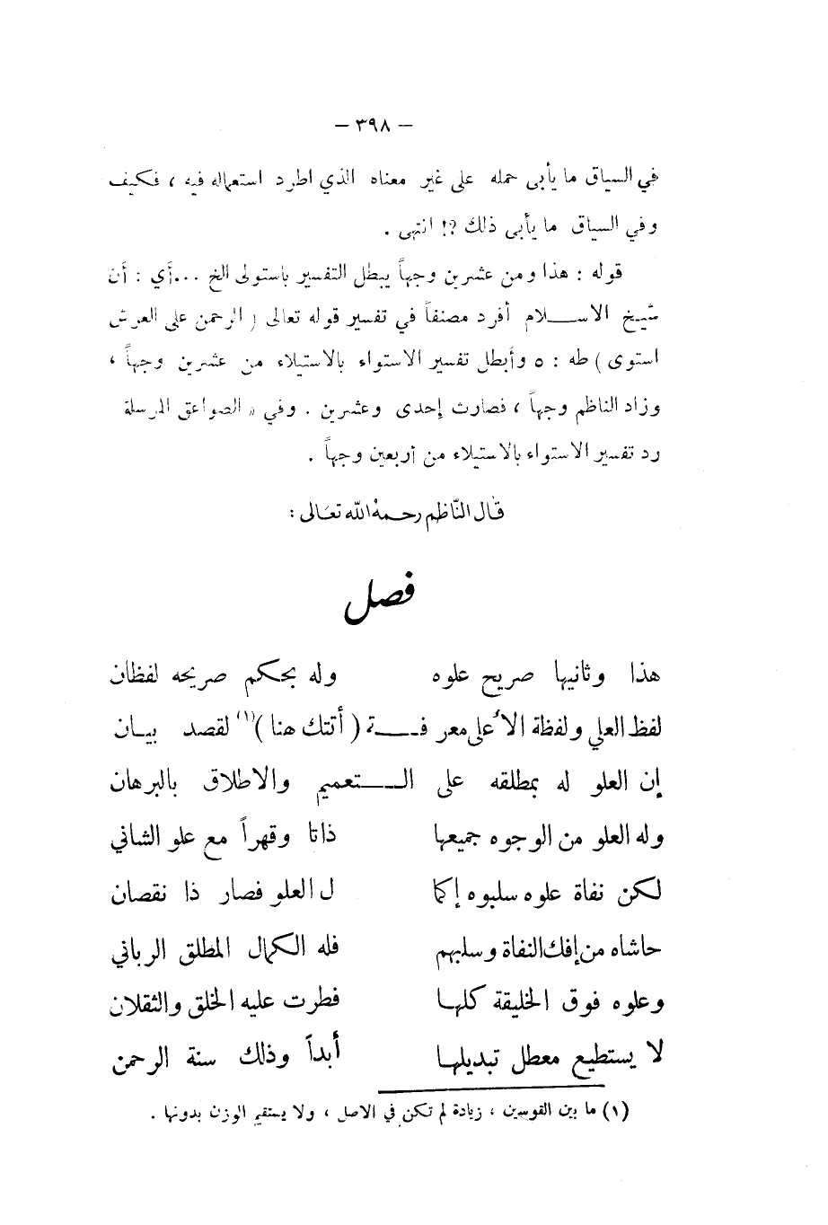 قَوْله هَذَا وَمن عشْرين وَجها يبطل التَّفْسِير باستولى الخ أَي أَن شيخ الاسلام أفرد مصنفا فِي تَفْسِير قَوْله تَعَالَى {الرَّحْمَن على الْعَرْش اسْتَوَى} طه 5 وأبطل تَفْسِير الاسْتوَاء بِالِاسْتِيلَاءِ من عشْرين وَجها وَزَاد النَّاظِم وَجها فَصَارَت إِحْدَى وَعشْرين وَفِي (الصَّوَاعِق الْمُرْسلَة رد تَفْسِير الاسْتوَاء بِالِاسْتِيلَاءِ من أَرْبَعِينَ وَجها