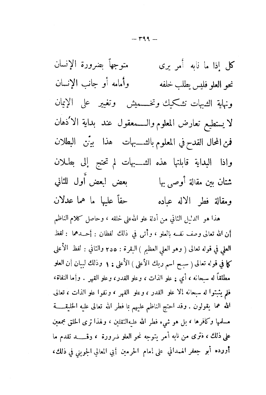 هَذَا هُوَ الدَّلِيل الثَّانِي من أَدِلَّة علو الله على خلقه وَحَاصِل كَلَام النَّاظِم أَن الله تَعَالَى وصف نَفسه بالعلو وأتى فِي ذَلِك لفظان أَحدهمَا لفظ الْعلي فِي قَوْله تَعَالَى {وَهُوَ الْعلي الْعَظِيم} الْبَقَرَة 255 وَالثَّانِي لفظ الاعلى كَمَا فِي قَوْله تَعَالَى {سبح اسْم رَبك الْأَعْلَى} الاعلى 1 وَذَلِكَ لبَيَان أَن الْعُلُوّ مُطلقًا لَهُ سُبْحَانَهُ أَي علو الذَّات وعلو الْقدر وعلو الْقَهْر وَأما النفاة فَلم يثبتوا لَهُ سُبْحَانَهُ الا علو الْقدر وعلو الْقَهْر وَنَفَوْا علو الذَّات تَعَالَى الله عَمَّا يَقُولُونَ وَقد احْتج النَّاظِم عَلَيْهِم بِمَا فطر الله تَعَالَى عَلَيْهِ الخليقة مسلمها وكافرها بل هُوَ شَيْء فطر الله عَلَيْهِ الثقلَيْن وَلِهَذَا ترى الْخلق مُجْمِعِينَ على ذَلِك فترى من نابه أَمر يتَوَجَّه نَحْو الْعُلُوّ ضَرُورَة وَقد تقدم مَا أوردهُ أَبُو جَعْفَر الْهَمدَانِي على إِمَام الْحَرَمَيْنِ أبي الْمَعَالِي الْجُوَيْنِيّ فِي ذَلِك