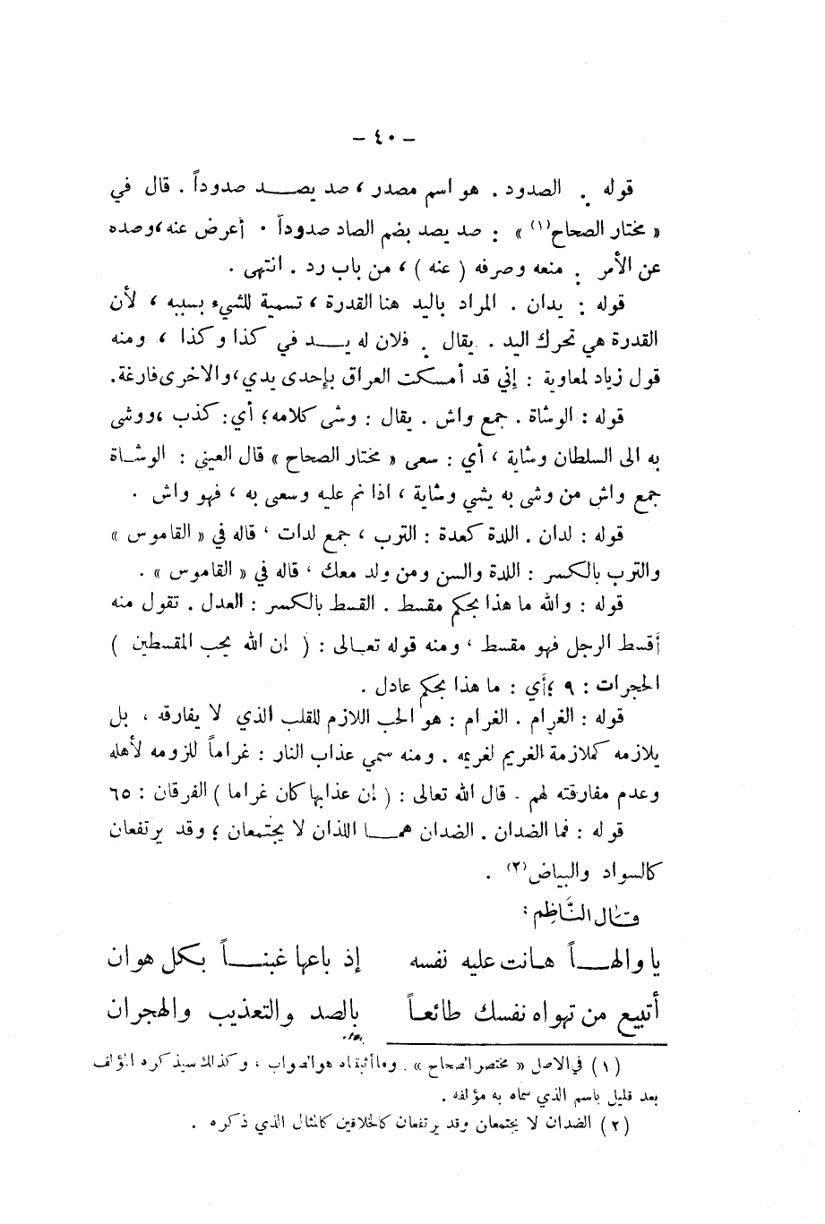 قَوْله الصدود هُوَ إسم مصدر صد يصد صدودا قَالَ فِي (مُخْتَار الصِّحَاح (صد يصد بِضَم الصَّاد صدودا أعرض عَنهُ وصده عَن الْأَمر مَنعه وَصَرفه (عَنهُ) من بَاب رد انْتهى