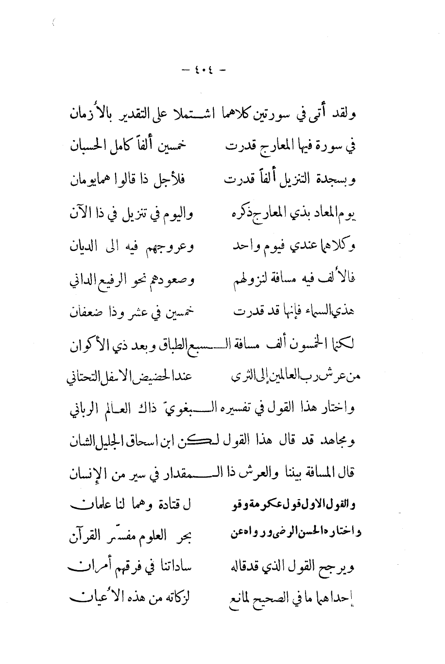 لكنما الْخَمْسُونَ الف مَسَافَة السَّبع الطباق وَبعد ذِي الأكوان ... من عرش رب الْعَالمين إِلَى الثرى