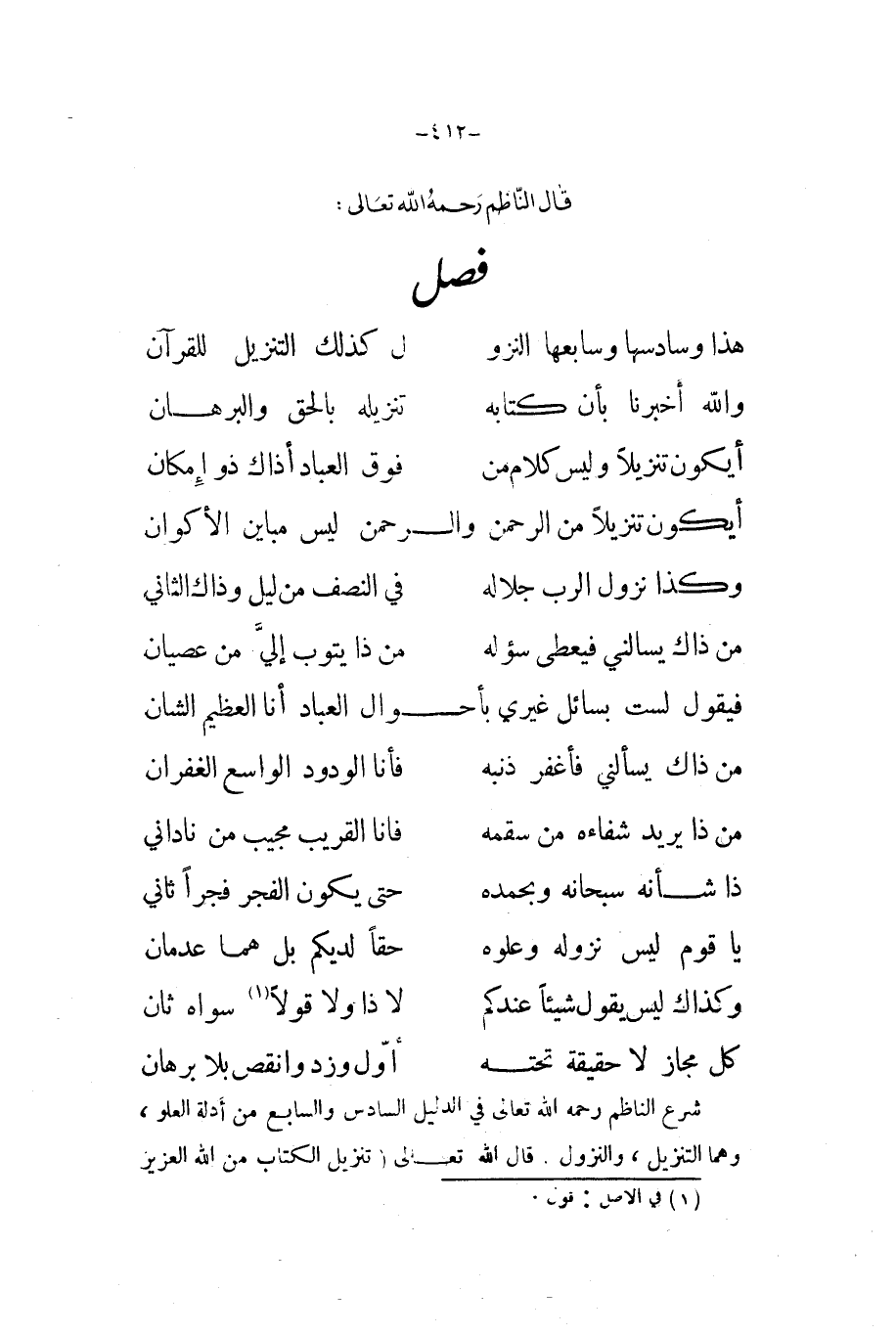 شرع النَّاظِم رَحمَه الله تَعَالَى فِي الدَّلِيل السَّادِس وَالسَّابِع من أَدِلَّة الْعُلُوّ وهما التَّنْزِيل وَالنُّزُول قَالَ الله تَعَالَى {تَنْزِيل الْكتاب من الله الْعَزِيز الْعَلِيم}