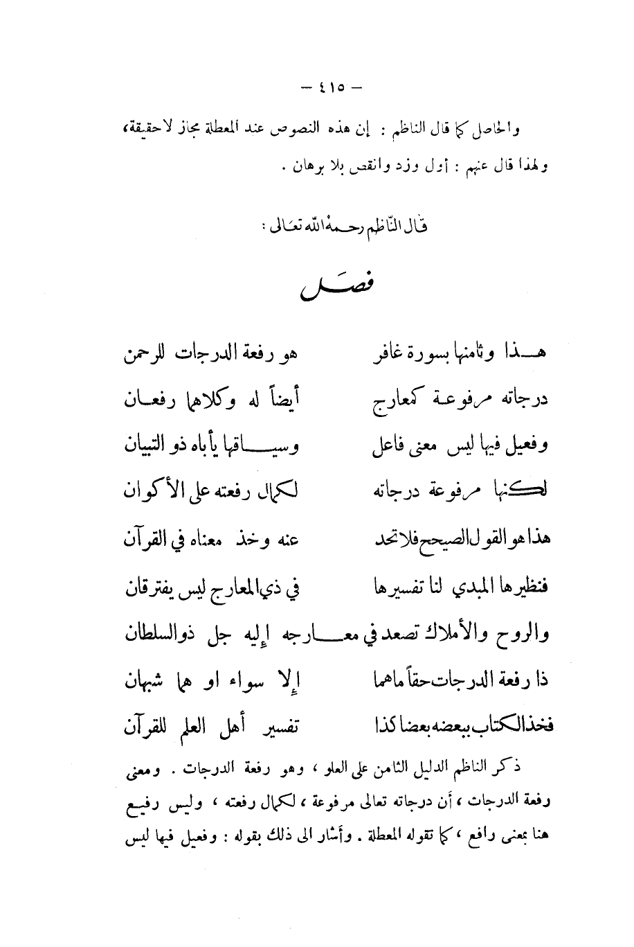 ذكر النَّاظِم الدَّلِيل الثَّامِن على الْعُلُوّ وَهُوَ رفْعَة الدَّرَجَات وَمعنى رفْعَة الدَّرَجَات أَن درجاته تَعَالَى مَرْفُوعَة لكَمَال رفعته وَلَيْسَ رفيع هُنَا بِمَعْنى رَافع كَمَا تَقوله المعطلة وَأَشَارَ الى ذَلِك بقوله وفعيل فِيهَا لَيْسَ