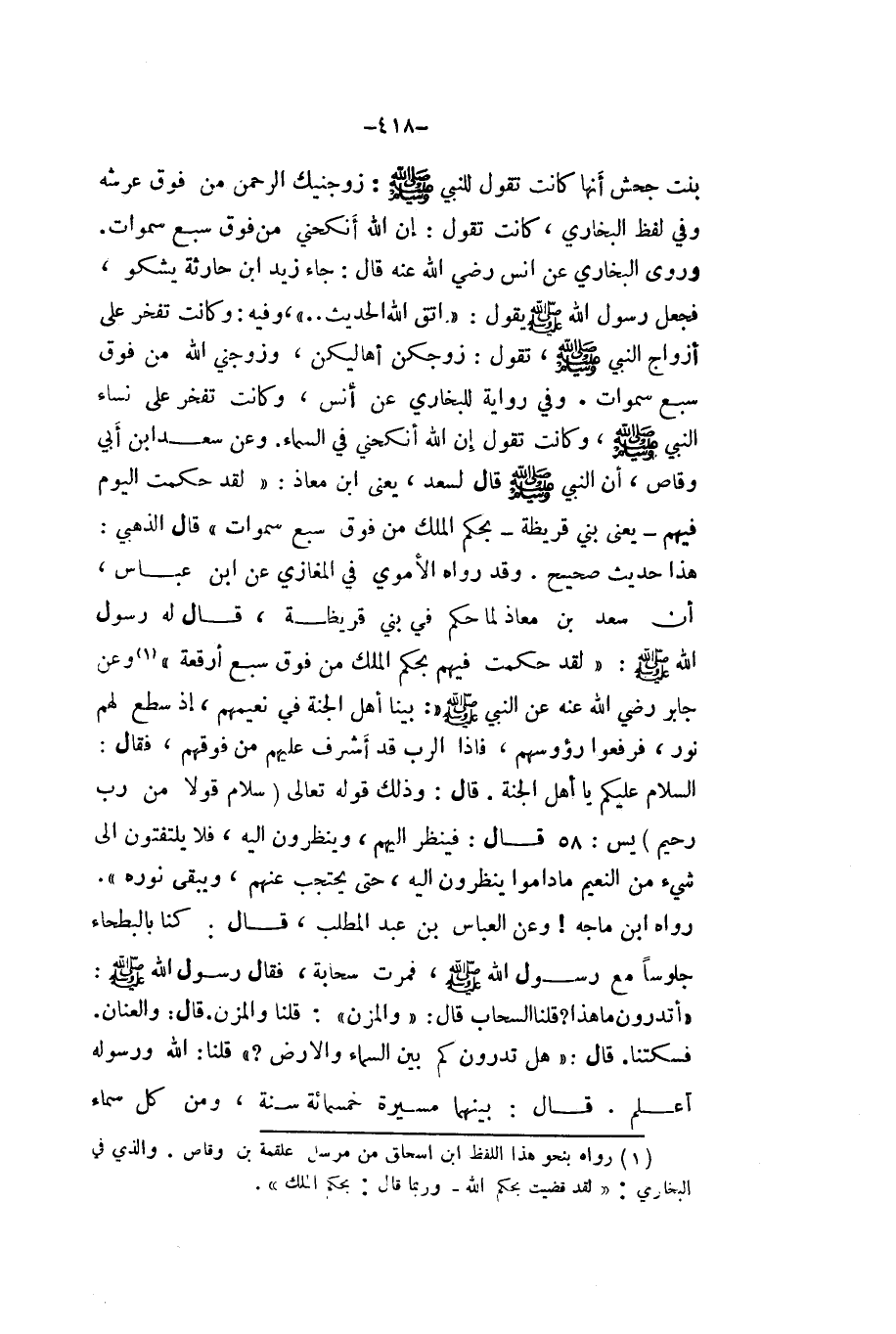 بنت جحش أَنَّهَا كَانَت تَقول للنَّبِي صلى الله عَلَيْهِ وَسلم زوجنيك الرَّحْمَن من فَوق عَرْشه وَفِي لفظ البُخَارِيّ كَانَت تَقول إِن الله أنكحني من فَوق سبع سموات وروى البُخَارِيّ عَن انس رَضِي الله عَنهُ قَالَ جَاءَ زيد ابْن حَارِثَة يشكو فَجعل رَسُول الله صلى الله عَلَيْهِ وَسلم يَقُول (اتَّقِ الله الحَدِيث (وَفِيه وَكَانَت تَفْخَر على أَزوَاج النَّبِي صلى الله عَلَيْهِ وَسلم تَقول زوجكن أهاليكن وزوجني الله من فَوق سبع سموات وَفِي رِوَايَة للْبُخَارِيّ عَن انس وَكَانَت تَفْخَر على نسَاء النَّبِي صلى الله عَلَيْهِ وَسلم وَكَانَت تَقول إِن الله أنكحني فِي السَّمَاء وَعَن سعد ابْن أبي وَقاص أَن النَّبِي صلى الله عَلَيْهِ وَسلم قَالَ لسعد يعْنى ابْن معَاذ (لقد حكمت الْيَوْم فيهم يَعْنِي بني قُرَيْظَة بِحكم الْملك من فَوق سبع سموات (قَالَ الذَّهَبِيّ هذاحديث صَحِيح وَقد رَوَاهُ الاموي فِي الْمَغَازِي عَن ابْن عَبَّاس ان سعد بن معَاذ لما حكم فِي بني قُرَيْظَة قَالَ لَهُ رَسُول الله صلى الله عَلَيْهِ وَسلم (لقد حكمت فيهم بِحكم الْملك من فَوق سبع أَرقعَة (وَعَن جَابر رَضِي الله عَنهُ عَن النَّبِي صلى الله عَلَيْهِ وَسلم (بَينا أهل الْجنَّة فِي نعيمهم إِذْ سَطَعَ لَهُم نور فَرفعُوا رؤوسهم فاذا الرب قد أشرف عَلَيْهِم من فَوْقهم فَقَالَ السَّلَام عَلَيْكُم يَا أهل الْجنَّة قَالَ وَذَلِكَ قَوْله تَعَالَى {سَلام قولا من رب رَحِيم} يس 58 قَالَ فَينْظر اليهم وَيَنْظُرُونَ اليه فَلَا يلفتون إِلَى شَيْء من النَّعيم مَا داموا ينظرُونَ إِلَيْهِ حَتَّى يحتجب عَنْهُم وَيبقى نوره (رَوَاهُ ابْن ماجة وَعَن الْعَبَّاس بن عبد الْمطلب قَالَ كُنَّا بالبطحاء جُلُوسًا مَعَ رَسُول الله صلى الله عَلَيْهِ وَسلم فمرت سَحَابَة فَقَالَ رَسُول الله صلى الله عَلَيْهِ وَسلم (اتدرون مَا هَذَا قُلْنَا السَّحَاب قَالَ (والمزن (قُلْنَا والمزن قَالَ والعنان فسكتنا قَالَ (هَل تَدْرُونَ كم بَين السَّمَاء والارض (قُلْنَا الله وَرَسُوله أعلم قَالَ بَينهمَا مسيرَة خَمْسمِائَة سنة وَمن كل سَمَاء