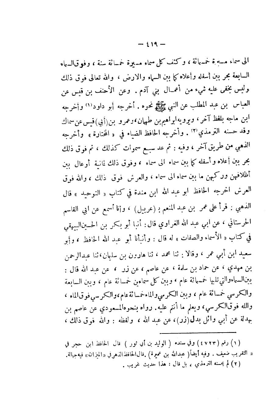 الى سَمَاء مسيرَة خَمْسمِائَة وكثف كل سَمَاء مسيرَة خَمْسمِائَة سنة وَفَوق السَّمَاء السَّابِعَة بَحر بَين أَسْفَله وَأَعلاهُ كَمَا بَين السَّمَاء والارض وَالله تَعَالَى فَوق ذَلِك وَلَيْسَ يخفى عَلَيْهِ شَيْء من أَعمال بني آدم وَعَن الاحنف بن قيس عَن الْعَبَّاس بن عبد الْمطلب عَن النَّبِي صلى الله عَلَيْهِ وَسلم نَحوه أخرجه أَبُو دَاوُد وَأخرجه ابْن ماجة بِلَفْظ آخر وَيَرْوِيه ابراهيم بن طهْمَان وَعَمْرو بن (أبي) قيس عَن سماك وَقد حسنه التِّرْمِذِيّ وَأخرجه الْحَافِظ الضياء فِي (المختارة (وَأخرجه الذَّهَبِيّ من طَرِيق آخر وَفِيه ثمَّ عد سبع سموات كَذَلِك ثمَّ فَوق ذَلِك بَحر بَين أَعْلَاهُ واسفله كَمَا بَين سَمَاء الى سَمَاء وَفَوق ذَلِك ثَمَانِيَة أوعال بَين إظلافهن وركبهن مَا بَين سَمَاء الى سَمَاء وَالْعرش فَوق ذَلِك وَالله فَوق الْعَرْش اخرجه الْحَافِظ ابو عبد الله ابْن مندة فِي كتاب (التَّوْحِيد (قَالَ الذَّهَبِيّ قَرَأَ على عمر بن عبد الْمُنعم ب (عربيل) وَأَنا أسمع عَن ابي الْقَاسِم الحرستاني عَن ابي عبد الله الغراوي قَالَ أنبا أَبُو بكر بن الْحُسَيْن الْبَيْهَقِيّ فِي كتاب (الاسماء وَالصِّفَات (لَهُ قَالَ وأنبأنا أَبُو عبد الله الْحَافِظ وَأَبُو سعيد ابْن أبي عمر وَقَالا ثَنَا مُحَمَّد ثَنَا هَارُون بن سُلَيْمَان ثَنَا عبد الرَّحْمَن بن مهْدي عَن حَمَّاد بن سَلمَة عَن عَاصِم عَن زر عَن عبد الله قَالَ بَين السَّمَاء وَالَّتِي تَلِيهَا خَمْسمِائَة عَام وَبَين كل سماءين خَمْسمِائَة عَام وَبَين السَّابِعَة والكرسي خَمْسمِائَة عَام وَبَين الْكُرْسِيّ وَالْمَاء خَمْسمِائَة عَام والكرسي فَوق المَاء وَالله فَوق الْكُرْسِيّ وَيعلم مَا انتم عَلَيْهِ رَوَاهُ بِنَحْوِهِ المَسْعُودِيّ عَن عَاصِم بن بَهْدَلَة عَن أبي وَائِل بدل (زر) عَن عبد الله وَلَفظه وَالله فَوق ذَلِك