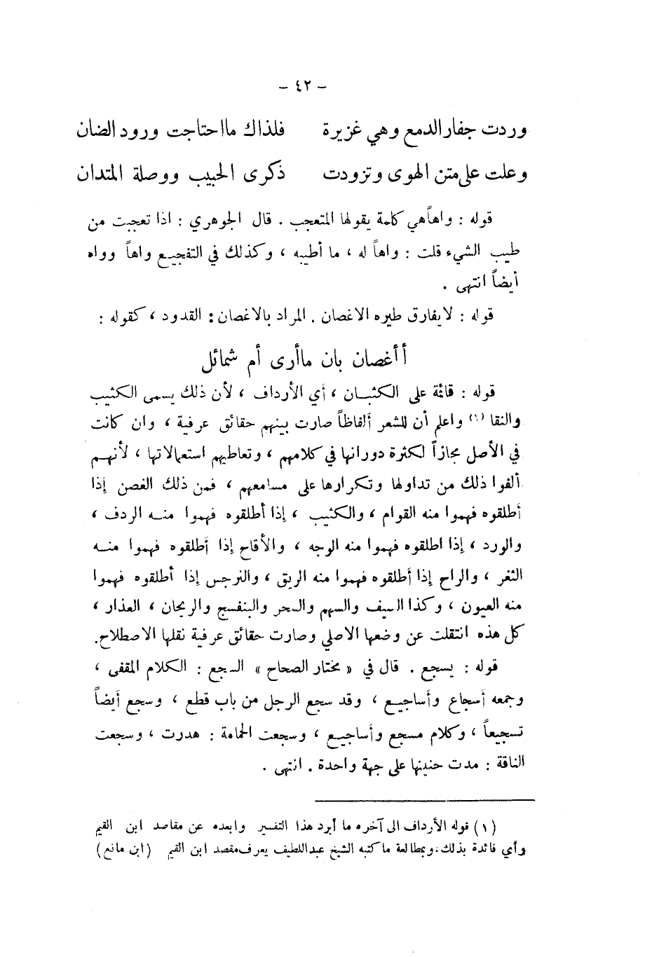 قَوْله قَائِمَة على الكثبان أَي الارداف لَان ذَلِك يُسمى الْكَثِيب والنقا وَاعْلَم أَن للشعر ألفاظا صَارَت بَينهم حقائق عرفية وان كَانَت فِي الاصل مجَازًا لِكَثْرَة دورانها فِي كَلَامهم وتعاطيهم استعمالاتها لانهم ألفوا ذَلِك من تداولها وتكرارها على مسامعهم فَمن ذَلِك الْغُصْن إِذا أَطْلقُوهُ فَهموا مِنْهُ القوام والكثيب إِذا أَطْلقُوهُ فَهموا مِنْهُ الردف والورد إِ ذَا اطلقوه فَهموا مِنْهُ الْوَجْه والاقاح إِذا أَطْلقُوهُ فَهموا مِنْهُ الثغر والراح إِذا أَطْلقُوهُ فَهموا مِنْهُ الرِّيق والنرجس إِذا أَطْلقُوهُ فَهموا مِنْهُ الْعُيُون وَكَذَا السَّيْف والسهم وَالْبَحْر والبنفسج وَالريحَان العذار كل هَذِه انْتَقَلت عَن وَضعهَا الاصلي وَصَارَت حقائق عرفية نقلهَا الِاصْطِلَاح