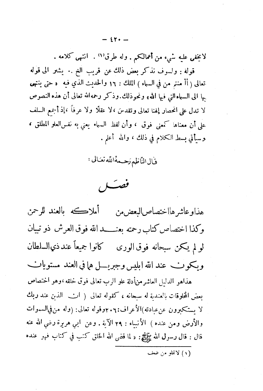 هَذَا هُوَ الدَّلِيل الْعَاشِر من أَدِلَّة علو الرب تَعَالَى فَوق خلقه وَهُوَ اخْتِصَاص بعض الْمَخْلُوقَات بالعندية لَهُ سُبْحَانَهُ كَقَوْلِه تَعَالَى {إِن الَّذين عِنْد رَبك لَا يَسْتَكْبِرُونَ عَن عِبَادَته} الاعراف 206 وَقَوله تَعَالَى {وَله من فِي السَّمَاوَات وَالْأَرْض وَمن عِنْده} الانبياء 29 الْآيَة وَعَن ابي هُرَيْرَة رَضِي الله عَنهُ قَالَ قَالَ رَسُول الله صلى الله عَنهُ وَسلم (لما قضى الله الْخلق كتب فِي كتاب فَهُوَ عِنْده