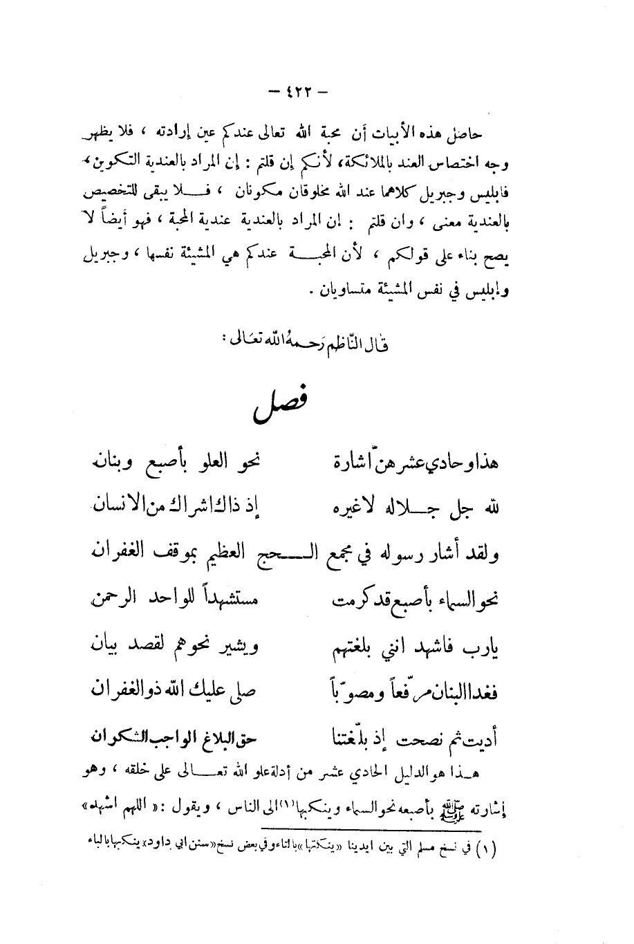 حَاصِل هَذِه الابيات أَن محبَّة الله تَعَالَى عنْدكُمْ عين إِرَادَته فَلَا يظْهر وَجه اخْتِصَاص العند بِالْمَلَائِكَةِ لأنكم إِن قُلْتُمْ إِن المُرَاد بالعندية التكوين فإبليس وَجِبْرِيل كِلَاهُمَا عِنْد الله مخلوقان مكونان فَلَا يبْقى لتخصيص بالعندية معنى وان قُلْتُمْ إِن المُرَاد بالعندية عندية الْمحبَّة فَهُوَ أَيْضا لَا يَصح بِنَاء على قَوْلكُم لِأَن الْمحبَّة عنْدكُمْ هِيَ الْمَشِيئَة نَفسهَا وَجِبْرِيل وإبليس فِي نفس الْمَشِيئَة متساويان