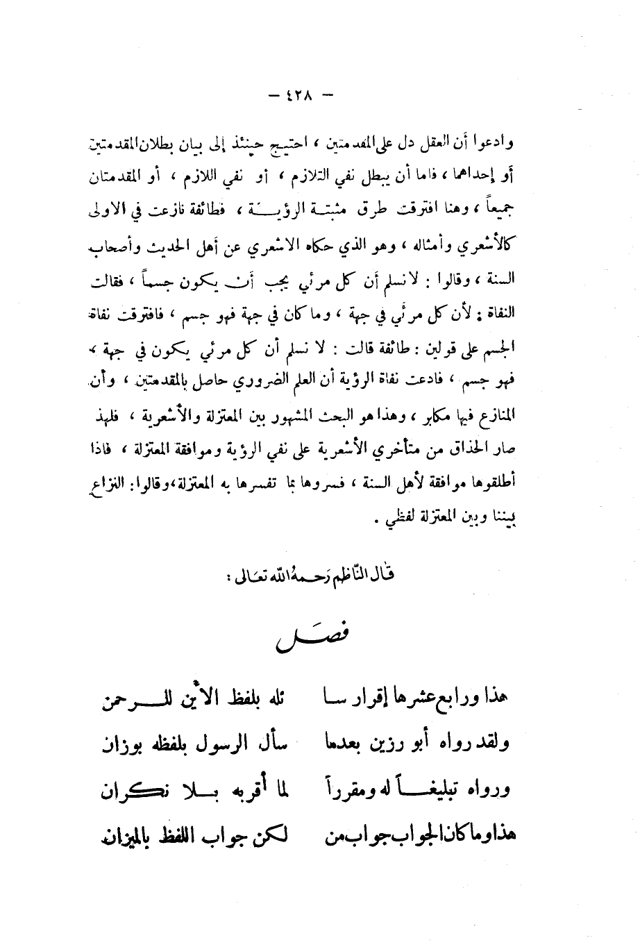 وَادعوا أَن الْعقل دلّ على المقدمتين احْتِيجَ حِينَئِذٍ الى بَيَان بطلَان المقدمتين أَو احداهما فاما ان يبطل نفي التلازم اَوْ نفي اللَّازِم اَوْ المقدمتان جَمِيعًا وَهنا افْتَرَقت طرق مثبتة الرُّؤْيَة فطائفة نازعت فِي الاولى كالاشعري وَأَمْثَاله وَهُوَ الَّذِي حَكَاهُ الاشعري عَن أهل الحَدِيث واصحاب السّنة وَقَالُوا لَا نسلم أَن كل مرئي يجب أَن يكون جسما فَقَالَت النفاة لَان كل مرئي فِي جِهَة وَمَا كَانَ فِي جِهَة فَهُوَ جسم فافترقت نفاة الْجِسْم على قَوْلَيْنِ طَائِفَة قَالَت لَا نسلم أَن كل مرئي يكون فِي جِهَة فَهُوَ جسم فادعت نفاة الرُّؤْيَة أَن الْعلم الضَّرُورِيّ حَاصِل بالمقدمتين وَأَن المنازع فِيهَا مكابر وَهَذَا هُوَ الْبَحْث الْمَشْهُور بَين الْمُعْتَزلَة والاشعرية فَلهَذَا صَار الحذاق من متأخري الاشعرية على نفي الرُّؤْيَة وموافقة الْمُعْتَزلَة فاذا اطلقوها مُوَافقَة لأهل السّنة فسروها بِمَا تفسرها بِهِ الْمُعْتَزلَة وَقَالُوا النزاع بَيْننَا وَبَين الْمُعْتَزلَة لَفْظِي