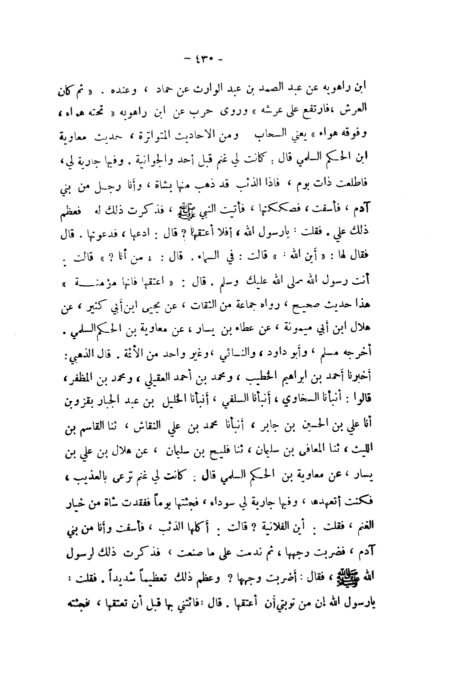 ابْن رَاهْوَيْةِ عَن عبد الصَّمد بن عبد الْوَارِث عَن حَمَّاد وَعِنْده (ثمَّ كَانَ الْعَرْش فارتفع على عَرْشه (وروى حَرْب عَن ابْن رَاهْوَيْةِ (تَحْتَهُ هَوَاء وفوقه هَوَاء (يَعْنِي السَّحَاب وَمن الاحاديث المتواترة حَدِيث مُعَاوِيَة ابْن الحكم السّلمِيّ قَالَ كَانَت لي غنم قبل اُحْدُ والجوانية وفيهَا جَارِيَة لي فاطلعت ذَات يَوْم فَإِذا الذِّئْب قد ذهب مِنْهَا بِشَاة وَأَنا رجل من بني آدم فأسفت فصككتها فَأتيت النَّبِي صلى الله عَلَيْهِ وَسلم فَذكرت ذَلِك لَهُ فَعظم ذَلِك عَليّ فَقلت يَا رَسُول الله أَفلا أعْتقهَا قَالَ ادعها فدعوتها قَالَ فَقَالَ لَهَا (أَيْن الله (قَالَت فِي السَّمَاء قَالَ (من أَنا (قَالَت أَنْت رَسُول الله صلى الله عَلَيْك وَسلم قَالَ (اعتقها فَإِنَّهَا مُؤمنَة (هَذَا حَدِيث صَحِيح رَوَاهُ جمَاعَة من الثِّقَات عَن يحيى ابْن أبي كثير عَن هِلَال ابْن أبي مَيْمُونَة عَن عَطاء بن يسَار عَن مُعَاوِيَة بن الحكم السّلمِيّ أخرجه مُسلم وَأَبُو دَاوُد وَالنَّسَائِيّ وَغير وَاحِد من الائمة قَالَ الذَّهَبِيّ أخبرنَا أَحْمد بن ابراهيم الْخَطِيب وَمُحَمّد بن أَحْمد الْعقيلِيّ وَمُحَمّد بن المظفر قَالُوا أَنبأَنَا السخاوي أَنبأَنَا السلَفِي أَنبأَنَا الْخَلِيل بن عبد الْجَبَّار بقزوين أَنا عَليّ بن الْحُسَيْن بن جَابر أَنبأَنَا مُحَمَّد بن عَليّ النقاش ثَنَا الْقَاسِم بن اللَّيْث ثَنَا الْمعَافى بن سُلَيْمَان ثَنَا فليح بن سُلَيْمَان عَن هِلَال بن عَليّ بن يسَار عَن مُعَاوِيَة بن الحكم السّلمِيّ قَالَ كَانَت لي غنم ترعى بالعذيب فَكنت أتعهدها وفيهَا جَارِيَة لي سَوْدَاء فجئتها يَوْمًا ففقدت شَاة من خِيَار الْغنم فَقلت أَيْن الْفُلَانِيَّة قَالَت أكلهَا الذِّئْب فأسفت وَأَنا من بني آدم فَضربت وَجههَا ثمَّ نَدِمت على مَا صنعت فَذكرت ذَلِك لرَسُول الله صلى الله عَلَيْهِ وَسلم فَقَالَ أضربت وَجههَا وَعظم ذَلِك تَعْظِيمًا شَدِيدا فَقلت يَا رَسُول الله إِن من تَوْبَتِي أَن أعْتقهَا قَالَ فائتني بهَا قبل أَن تعتقها فَجِئْته
