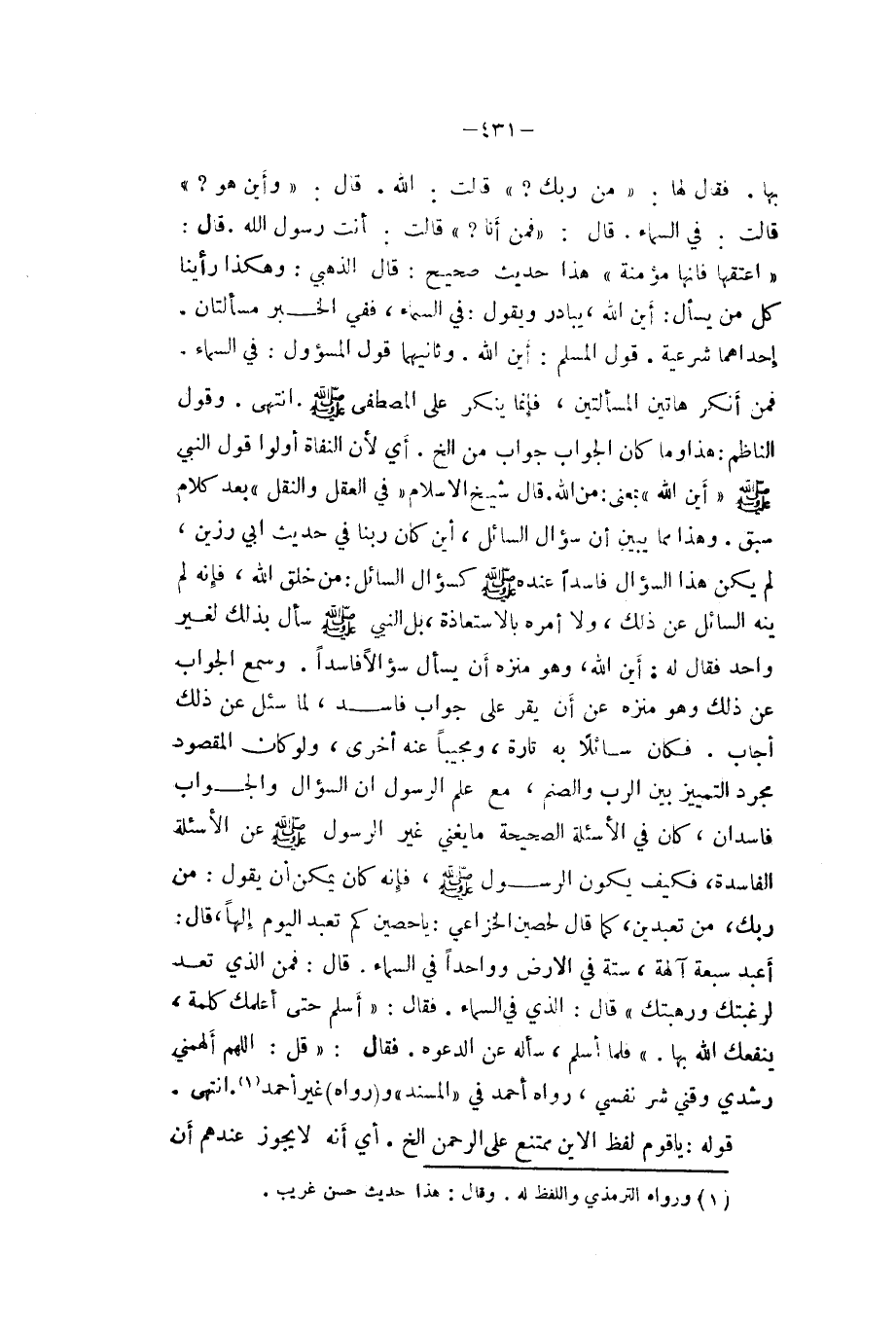 بهَا فَقَالَ لَهَا (من رَبك (قَالَت الله قَالَ (وَأَيْنَ هُوَ (قَالَت فِي السَّمَاء قَالَ (فَمن أَنا (قَالَت أَنْت رَسُول الله قَالَ (اعتقها فانها مُؤمنَة (هَذَا حَدِيث صَحِيح قَالَ الذَّهَبِيّ وَهَكَذَا رَأينَا كل من يسْأَل أَيْن الله يُبَادر وَيَقُول فِي السَّمَاء فَفِي الْخَبَر مَسْأَلَتَانِ أحداهما شَرْعِيَّة قَول الْمُسلم أَيْن الله وَثَانِيهمَا قَول المسؤول فِي السَّمَاء فَمن أنكر هَاتين الْمَسْأَلَتَيْنِ فَإِنَّمَا يُنكر على الْمُصْطَفى صلى الله عَلَيْهِ وَسلم انْتهى وَقَول النَّاظِم هَذَا وَمَا كَانَ الْجَواب جَوَاب من الخ أَي لِأَن النفاة اولوا قَول النَّبِي صلى الله عَلَيْهِ وَسلم (ايْنَ الله (بِمَعْنى من الله قَالَ شيخ الاسلام (فِي الْعقل وَالنَّقْل (بعد كَلَام سبق وَهَذَا مِمَّا يبين أَن سُؤال السَّائِل أَيْن كَانَ رَبنَا فِي حَدِيث ابْن رزين لم يكن هَذَا السُّؤَال فَاسِدا عِنْده صلى الله عَلَيْهِ وَسلم كسؤال السَّائِل من خلق الله فَإِنَّهُ لم ينْه السَّائِل عَن ذَلِك وَلَا أمره بالإستعاذه بل النَّبِي صلى الله عَلَيْهِ وَسلم سَأَلَ بذلك لغير وَاحِد فَقَالَ لَهُ أَيْن الله وَهُوَ منزه أَن يسْأَل سؤالا فَاسِدا وَسمع الْجَواب عَن ذَلِك وَهُوَ منزه عَن أَن يقر على جَوَاب فَاسد لما سُئِلَ عَن ذَلِك أجَاب فَكَانَ سَائِلًا بِهِ تَارَة ومجيبا عَنهُ أُخْرَى وَلَو كَانَ الْمَقْصُود مُجَرّد التَّمْيِيز بَين الرب والصنم مَعَ علم الرَّسُول ان السُّؤَال وَالْجَوَاب فاسدان كَانَ فِي الاسئلة الصَّحِيحَة مَا يُغني غير الرَّسُول صلى الله عَلَيْهِ وَسلم عَن الاسئلة الْفَاسِدَة فَكيف يكون الرَّسُول صلى الله عَلَيْهِ وَسلم فَإِنَّهُ كَانَ يُمكن أَن يَقُول من رَبك من تعبدين كَمَا قَالَ لحصين الْخُزَاعِيّ يَا حُصَيْن كم تعبد الْيَوْم إِلَهًا قَالَ أعبد سَبْعَة آلِهَة سِتَّة فِي الارض وواحدا فِي السَّمَاء قَالَ فَمن الَّذِي تعد لرغبتك ورهبتك (قَالَ الَّذِي فِي السَّمَاء فَقَالَ (أسلم حَتَّى إعلمك كلمة ينفعك الله بهَا (فَلَمَّا أسلم سَأَلَهُ عَن الدعْوَة فَقَالَ (قل اللَّهُمَّ ألهمني رشدي وقني شَرّ نَفسِي رَوَاهُ أَحْمد فِي (الْمسند (و (رَوَاهُ) غير أَحْمد انْتهى