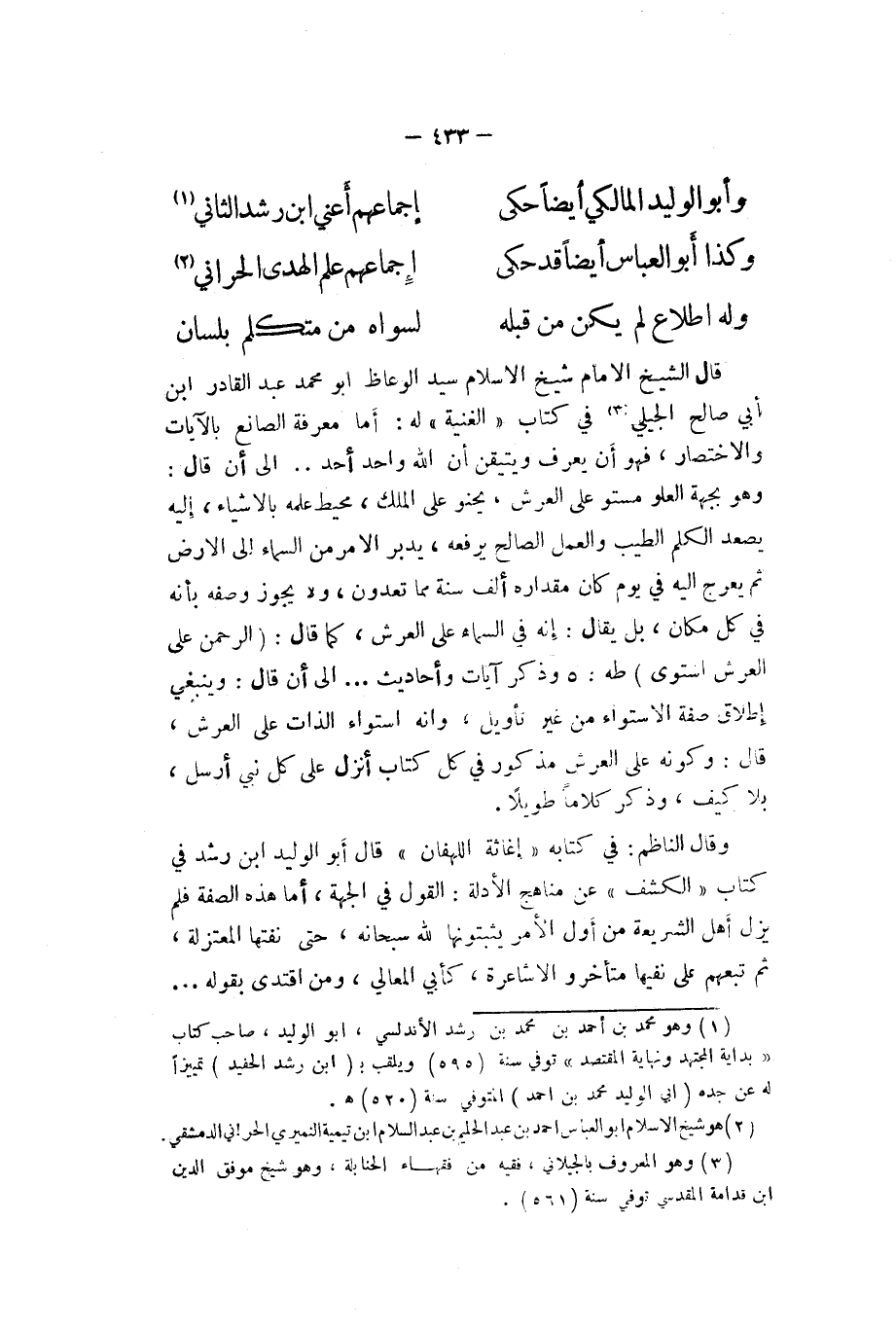 وَقَالَ النَّاظِم فِي كِتَابه (إغاثة اللهفان (قَالَ أَبُو الْوَلِيد ابْن رشد فِي كتاب (الْكَشْف (عَن مناهج الْأَدِلَّة القَوْل فِي الْجِهَة أما هَذِه الصّفة فَلم يزل أهل الشَّرِيعَة من أول الْأَمر بثبوتها لله سُبْحَانَهُ حَتَّى نفتها الْمُعْتَزلَة ثمَّ تَبِعَهُمْ على نَفيهَا متأخرو الأشاعرة كَأبي الْمَعَالِي وَمن اقْتدى بقوله