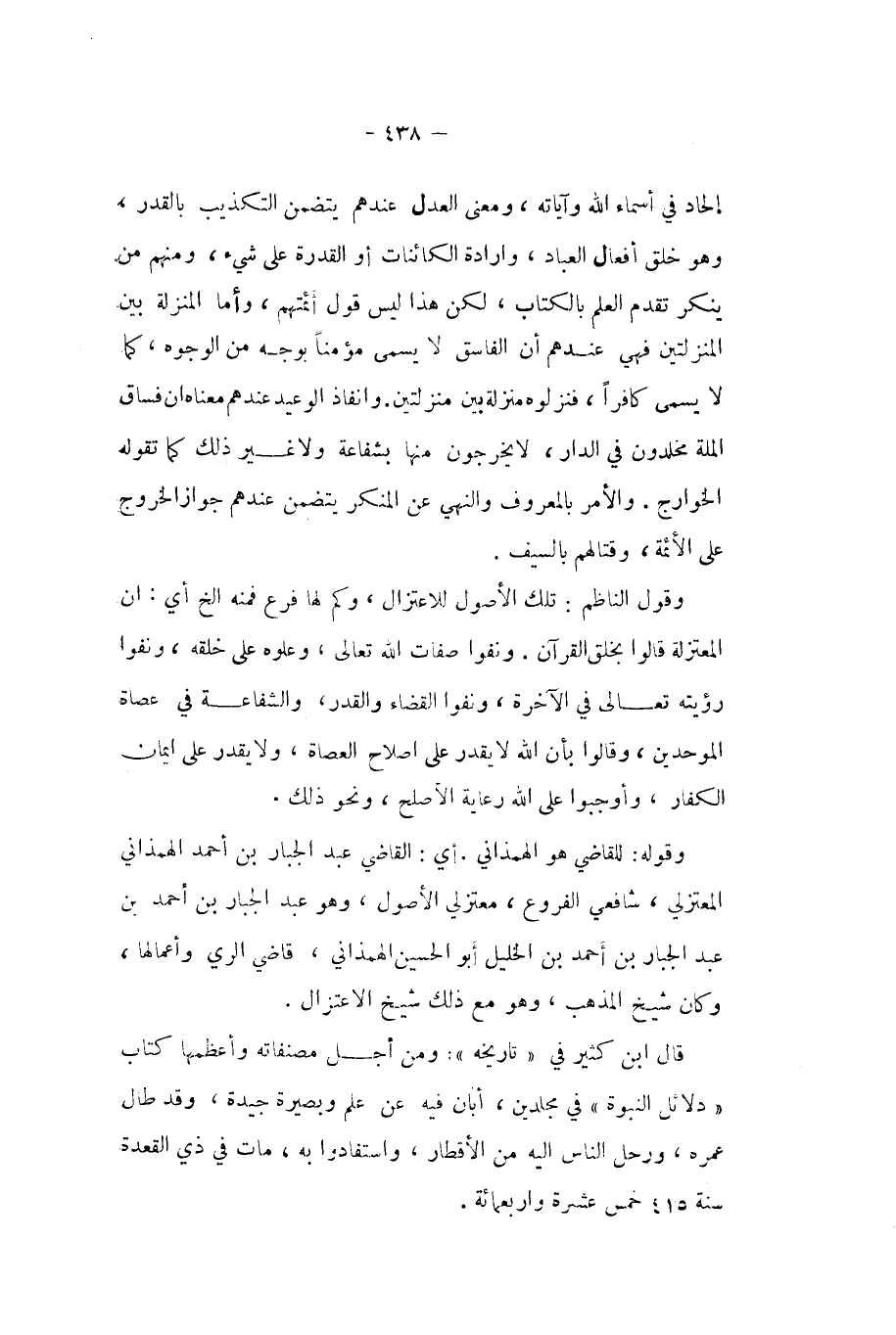 إلحاد فِي اسماء الله وآياته وَمعنى الْعدْل عِنْدهم يتَضَمَّن التَّكْذِيب بِالْقدرِ وَهُوَ خلق أَفعَال الْعباد وَإِرَادَة الكائنات أَو الْقُدْرَة على شيئ وَمِنْهُم من يُنكر تقدم الْعلم بِالْكتاب لَكِن هَذَا لَيْسَ قَول أئمتهم وَأما الْمنزلَة بَين المنزلتين فَهِيَ عِنْدهم أَن الْفَاسِق لَا يُسمى مُؤمنا بِوَجْه من الْوُجُوه كَمَا لَا يُسمى كَافِرًا فنزلوه منزلَة بَين منزلتين وإنفاذ الْوَعيد عِنْدهم مَعْنَاهُ أَن فساق الْملَّة مخلدون فِي الدَّار لَا يخرجُون مِنْهَا بشفاعة وَلَا غير ذَلِك كَمَا تَقوله الْخَوَارِج وَالْأَمر بِالْمَعْرُوفِ وَالنَّهْي عَن الْمُنكر يتَضَمَّن عِنْدهم جَوَاز الْخُرُوج على الْأَئِمَّة وقتالهم بِالسَّيْفِ