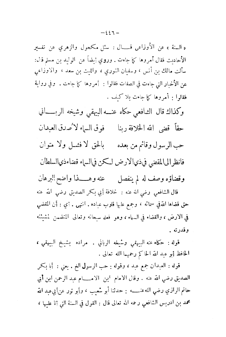 (السّنة (عَن الاوزاعي قَالَ سُئِلَ مَكْحُول وَالزهْرِيّ عَن تَفْسِير الاحاديث فَقَالَ أمروها كَمَا جَاءَت وَرُوِيَ أَيْضا عَن الْوَلِيد بن مُسلم قَالَ سَأَلت مَالك بن أنس وسُفْيَان الثَّوْريّ وَاللَّيْث بن سعد والاوزاعي عَن الاخبار الَّتِي جَاءَت فِي الصِّفَات فَقَالُوا أمروها كَمَا جَاءَت وَفِي رِوَايَة فَقَالُوا أمروها كَمَا جَاءَت بِلَا كَيفَ ... وكذاك قَالَ الشَّافِعِي حَكَاهُ عَنهُ الْبَيْهَقِيّ وَشَيْخه الرباني