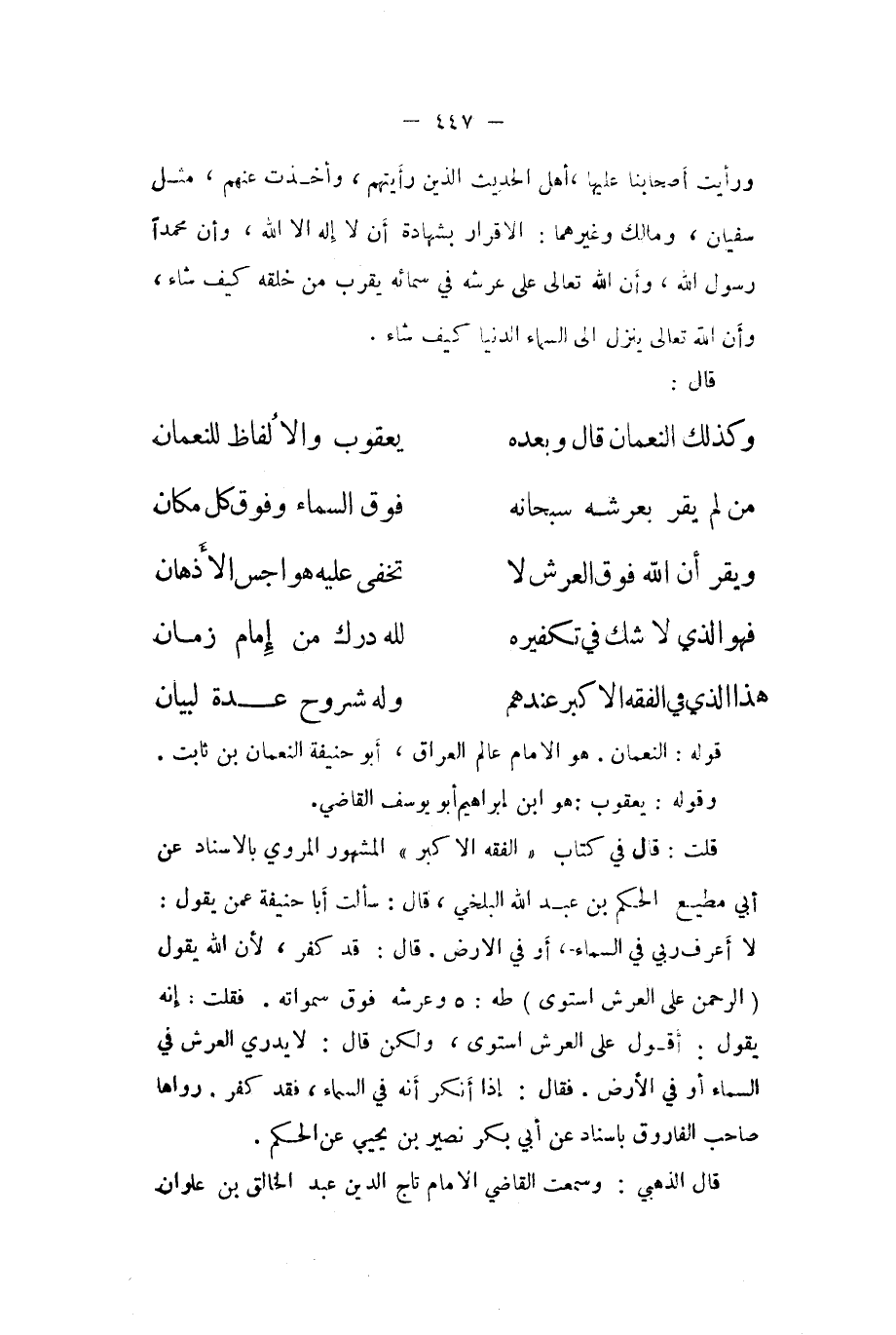 وَرَأَيْت أَصْحَابنَا عَلَيْهَا أهل الحَدِيث الَّذين رَأَيْتهمْ وَأخذت عَنْهُم مثل سُفْيَان وَمَالك وَغَيرهمَا الاقرار بِشَهَادَة أَن لَا أَله الا الله وَأَن مُحَمَّدًا رَسُول الله وَأَن الله تَعَالَى على عَرْشه فِي سمائه يقرب من خلقه كَيفَ شَاءَ وَأَن الله تَعَالَى ينزل الى السَّمَاء الدُّنْيَا كَيفَ شَاءَ