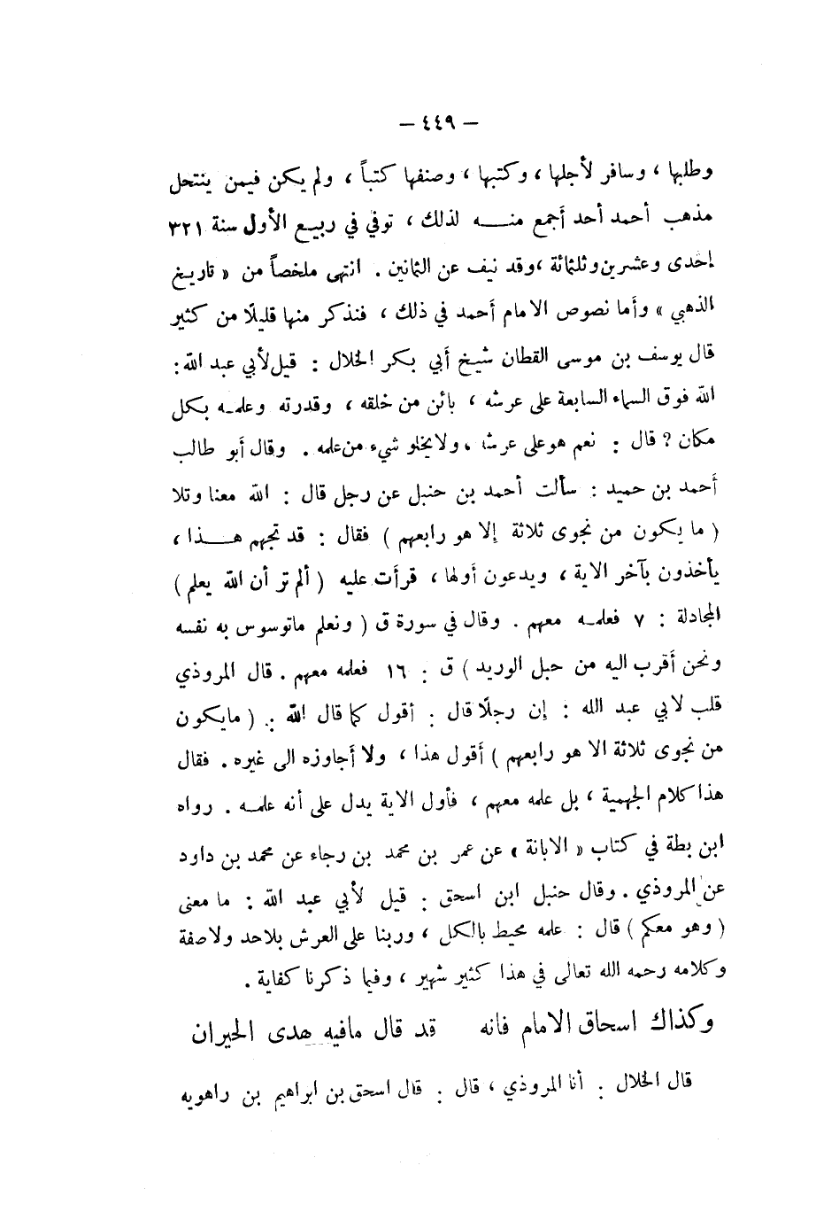 وطلبها وسافر لأَجلهَا وكتبها وصنفها كتبا وَلم يكن فِيمَن ينتحل مَذْهَب أَحْمد أحد أجمع مِنْهُ لذَلِك توفّي فِي ربيع الاول سنة 321 إِحْدَى وَعشْرين وثلثمائة وَقد نَيف عَن الثَّمَانِينَ انْتهى مُلَخصا من (تَارِيخ الذَّهَبِيّ (وَأما نُصُوص الامام أَحْمد فِي ذَلِك فَنَذْكُر مِنْهَا قَلِيلا من كثير قَالَ يُوسُف بن مُوسَى الْقطَّان شيخ أبي بكر الْخلال قيل لأبي عبد الله الله فَوق السَّمَاء السَّابِعَة على عَرْشه بَائِن من خلقه وَقدرته وَعلمه بِكُل مَكَان قَالَ نعم هُوَ على عَرْشه وَلَا يَخْلُو شَيْء من علمه وَقَالَ أَبُو طَالب أَحْمد بن حميد سَأَلت أَحْمد بن حَنْبَل عَن رجل قَالَ الله مَعنا وتلا {مَا يكون من نجوى ثَلَاثَة إِلَّا هُوَ رابعهم} فَقَالَ قد تجهم هَذَا يَأْخُذُونَ بآخر الاية وَيدعونَ أَولهَا قَرَأت عَلَيْهِ {ألم تَرَ أَن الله يعلم} المجادلة 7 فَعلمه مَعَهم وَقَالَ فِي سُورَة ق {ونعلم مَا توسوس بِهِ نَفسه وَنحن أقرب إِلَيْهِ من حَبل الوريد} ق 16 فَعلمه مَعَهم قَالَ الْمَرْوذِيّ قلب لابي عبد لله إِن رجلا قَالَ أَقُول كَمَا قَالَ الله {مَا يكون من نجوى ثَلَاثَة إِلَّا هُوَ رابعهم} أَقُول هَذَا وَلَا أجاوزه الى غَيره فَقَالَ هَذَا كَلَام الْجَهْمِية بل علمه مَعَهم فَأول الاية يدل على أَنه علمه رَوَاهُ ابْن بطة فِي كتاب (الابانة (عَن عمر بن مُحَمَّد بن رَجَاء عَن مُحَمَّد بن دَاوُد عَن الْمَرْوذِيّ وَقَالَ حَنْبَل ابْن اسحق قيل لأبي عبد الله مَا معنى {وَهُوَ مَعكُمْ} قَالَ علمه مُحِيط بِالْكُلِّ وربنا على الْعَرْش بلاحد وَلَا صفة وَكَلَامه رَحمَه الله تَعَالَى فِي هَذَا كثير شهير وَفِيمَا ذكرنَا كِفَايَة ... وكذاك اسحاق الامام فانه ... قد قَالَ مَا فِيهِ هدى الحيران ...