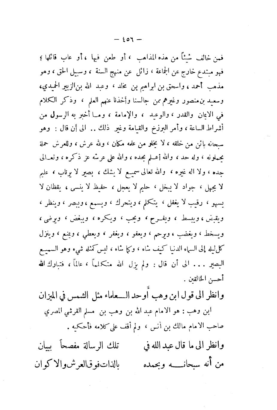 فَمن خَالف شَيْئا من هَذِه الْمذَاهب أَو طعن فِيهَا أَو عَابَ قَائِلهَا فَهُوَ مُبْتَدع خَارج عَن الْجَمَاعَة زائل عَن مَنْهَج السّنة وسبيل الْحق وَهُوَ مَذْهَب أَحْمد واسحق بن ابراهيم بن مخلد وَعبد الله بن الزبيير الْحميدِي وَسَعِيد بن مَنْصُور وَغَيرهم مِمَّن جالسنا وأخذنا عَنْهُم الْعلم وَذكر الْكَلَام فِي الايمان وَالْقدر والوعيد والامامة وَمَا أخبر بِهِ الرَّسُول من أَشْرَاط السَّاعَة وَأمر البرزخ وَالْقِيَامَة وَغير ذَلِك الى أَن قَالَ وَهُوَ سُبْحَانَهُ بَائِن من خلقه لَا يَخْلُو من علمه مَكَان وَللَّه عرش وللعرش حَملَة يحملونه وَله حد وَالله أعلم بحده وَالله على عَرْشه عز ذكره وَتَعَالَى جده والا اله غَيره وَالله تَعَالَى سميع لَا يشك بَصِير لَا يرتاب عليم لَا يجهل جواد لَا يبخل حَلِيم لَا يعجل حفيظ لَا ينسى يقظان لَا يسهو رَقِيب لَا يغْفل يتَكَلَّم ويتحرك وَيسمع ويبصر وَينظر وَيقبض ويبسط ويفرح وَيُحب وَيكرهُ وَيبغض ويرضى ويسخط ويغضب وَيرْحَم وَيَعْفُو وَيغْفر وَيُعْطِي وَيمْنَع وَينزل كل لَيْلَة الى السَّمَاء الدُّنْيَا كَيفَ شَاءَ وكما شَاءَ لَيْسَ كمثله شَيْء وَهُوَ السَّمِيع الْبَصِير الى أَن قَالَ وَلم يزل الله متكلما عَالما فَتَبَارَكَ الله أحسن الْخَالِقِينَ ... وَانْظُر الى قَول ابْن وهب اوحد الْعلمَاء مثل الشَّمْس فِي الْمِيزَان ...