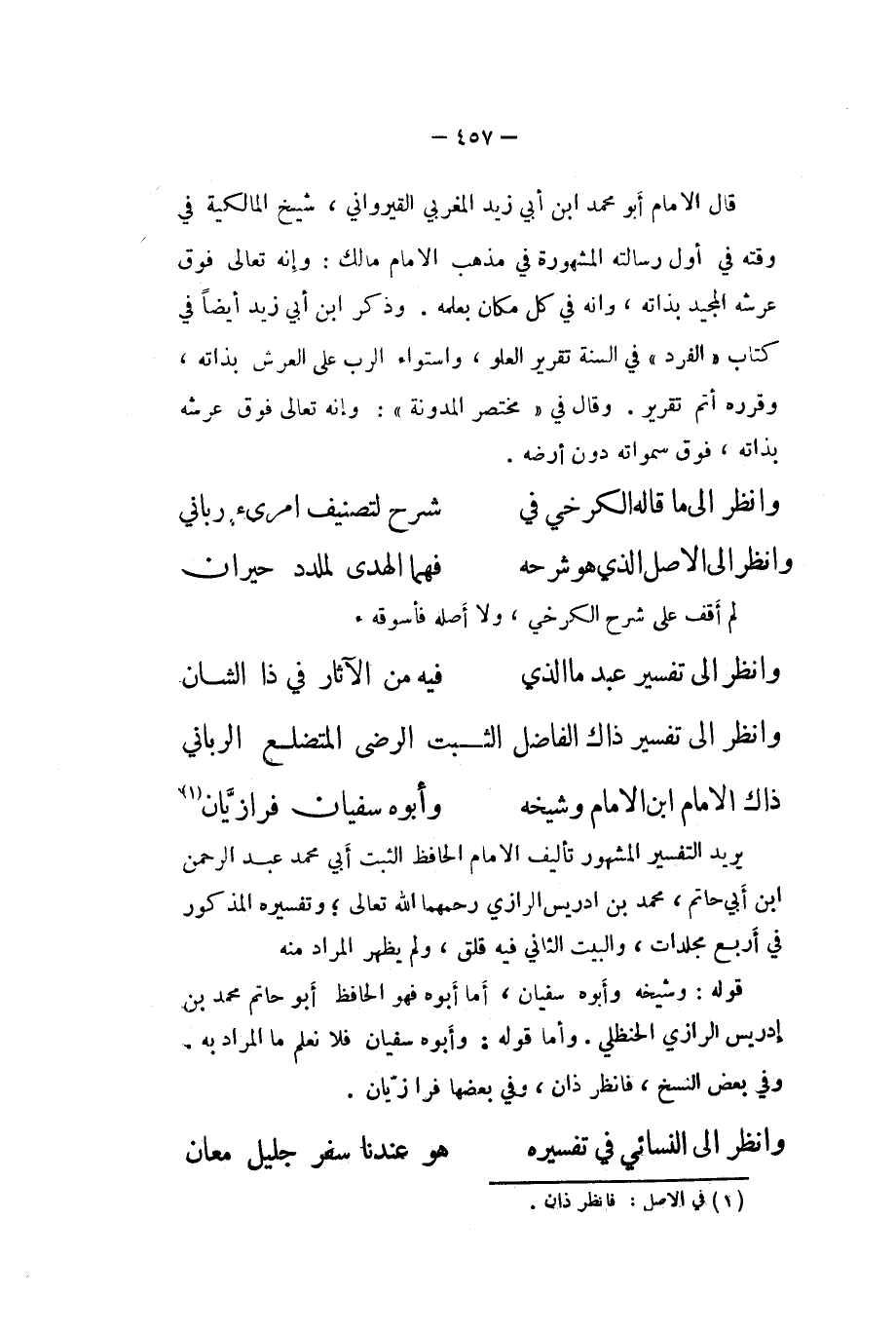 قَالَ الإِمَام أَبُو مُحَمَّد ابْن أبي زيد المغربي القيرواني شيخ الْمَالِكِيَّة فِي وقته فِي أول رسَالَته الْمَشْهُورَة فِي مَذْهَب الإِمَام مَالك وَإنَّهُ تَعَالَى فَوق عَرْشه الْمجِيد بِذَاتِهِ وَأَنه فِي كل مَكَان بِعِلْمِهِ وَذكر ابْن أبي زيد أَيْضا فِي كتاب (الْفَرد (فِي السّنة تَقْرِير الْعُلُوّ واستواء الرب على الْعَرْش بِذَاتِهِ وَقَررهُ أتم تَقْرِير وَقَالَ فِي (مُخْتَصر الْمُدَوَّنَة (وَإنَّهُ تَعَالَى فَوق عَرْشه بِذَاتِهِ فَوق سمواته دون أرضه
