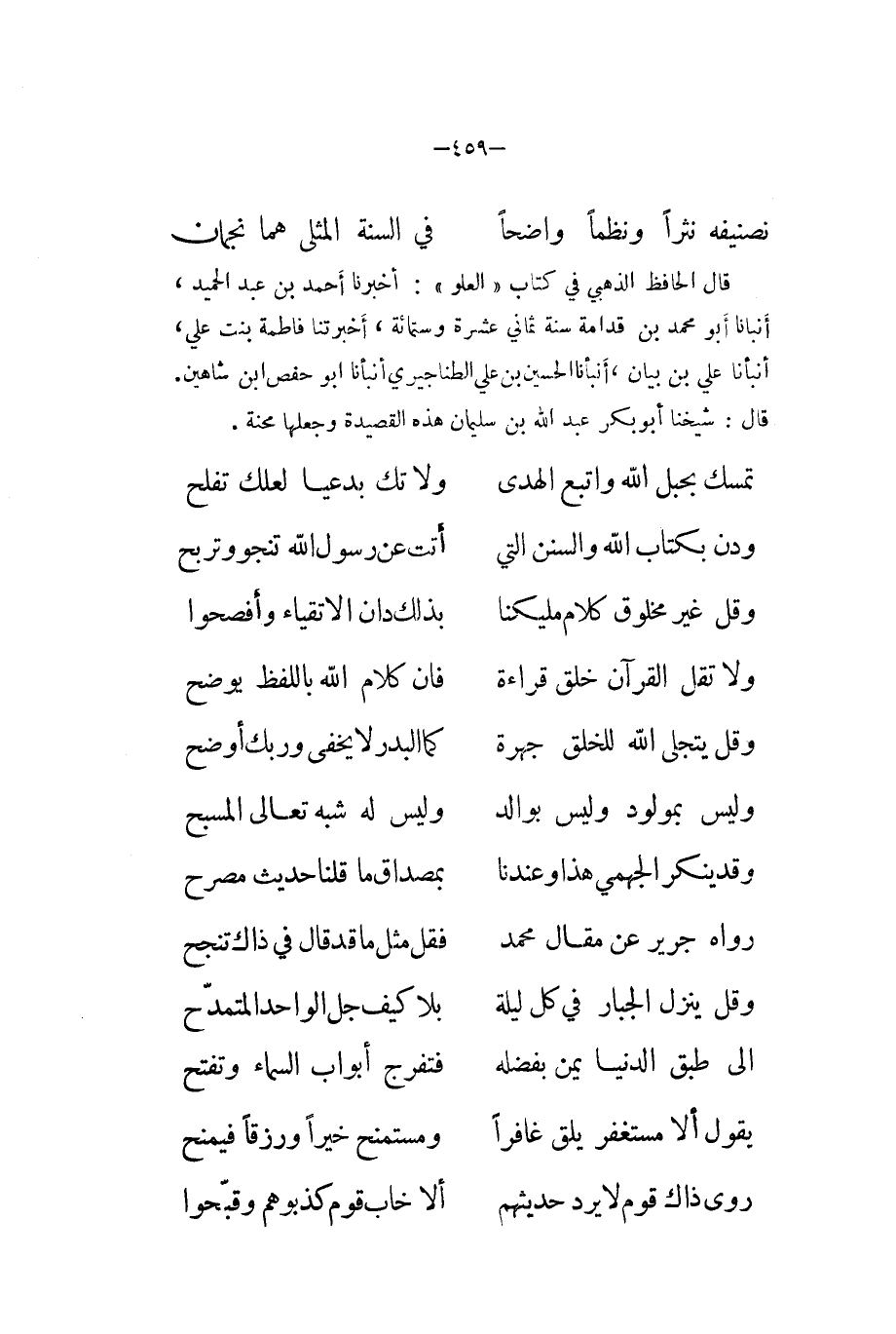 قَالَ الحافظي الذَّهَبِيّ فِي كتاب (الْعُلُوّ (اُخْبُرْنَا أَحْمد بن عبد الحميد أَنبأَنَا أَبُو مُحَمَّد بن قدامَة سنة ثَمَانِي عشرَة وسِتمِائَة أخبرتنا فَاطِمَة بنت عَليّ أَنبأَنَا عَليّ بن بَيَان أَنبأَنَا الْحُسَيْن بن عَليّ الطناجيري انبأنا أَبُو حَفْص ابْن شاهين قَالَ شَيخنَا أَبُو بكر عبد الله بن سُلَيْمَان هَذِه القصيدة وَجعلهَا محنة