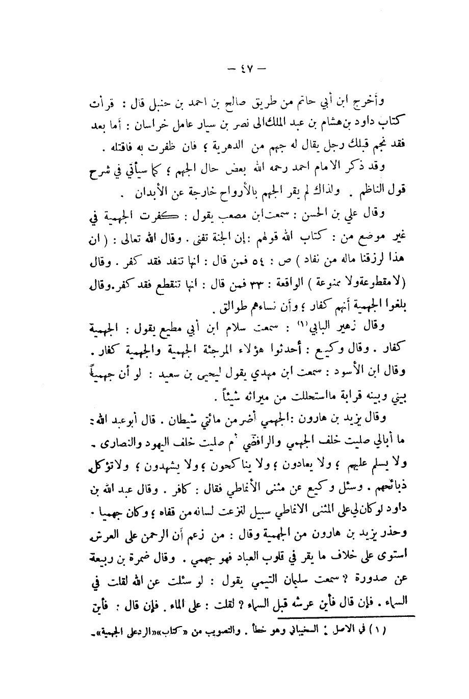وَأخرج ابْن أبي حَاتِم من طَرِيق صَالح بن احْمَد بن حَنْبَل قَالَ قَرَأت كتاب دَاوُد بن هِشَام بن عبد الْملك الى نصر بن سيار عَامل خُرَاسَان أما بعد فقد نجم قبلك رجل يُقَال لَهُ جهم من الدهرية قَالَ فَإِن ظَفرت بِهِ فاقتله