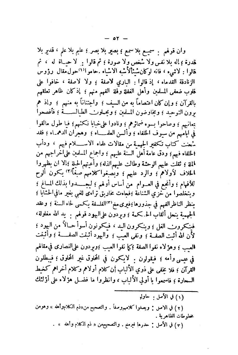 وان قَوْلهم سميع بِلَا سمع بَصِير بِلَا بصر عليم بِلَا علم قدير بِلَا قدرَة إِلَه بِلَا نفس وَلَا شخص وَلَا صُورَة ثمَّ قَالُوا لَا حَيَاة لَهُ ثمَّ قَالُوا لَا شَيْء فانه لَو كَانَ شَيْئا لاشبه الاشياء حاموا حول مقَال رُؤُوس الزَّنَادِقَة القدماء إِذْ قَالُوا الْبَارِي لَا صفة وَلَا لَا صفة خَافُوا على قُلُوب ضعفى الْمُسلمين وَأهل الْغَفْلَة وقلن الْفَهم مِنْهُم إِذْ كَانَ ظَاهر تعلقهم بِالْقُرْآنِ وَإِن كَانَ اعتصاما بِهِ من السَّيْف واجتنانا بِهِ مِنْهُم وَإِذ هم يرَوْنَ التَّوْحِيد ويخاوضون الْمُسلمين ويحملون الطيالسة فأفصحوا بمعانيهم وصاحوا بِسوء ضمائرهم وَنَادَوْا على خبايا نكثهم فيا طول مَا لقوا فِي ايامهم من سيوف الْخُلَفَاء وألسن الْعلمَاء وهجران الدهماء فقد شحنت كتاب تَكْفِير الْجَهْمِية من مقالات عُلَمَاء الاسلام فيهم ودأب الْخُلَفَاء فيهم ودق عَامَّة أهل السّنة عَلَيْهِم وأجماع الْمُسلمين على اخراجهم من الْملَّة ثقلت عَلَيْهِم الوحشة وطالت عَلَيْهِم الذلة واعيتهم الْحِيلَة إِلَّا ان يظهروا الْخلاف لاولاهم وَالرَّدّ عَلَيْهِم ويصبغوا كَلَامهم صبغا يكون ألوح للافهام وانجع فِي الْعَوام من أساس أَوَّلهمْ ليجدوا بذلك المساغ ويتخلصوا من خزي الشناعة فَجَاءَت مخاريق ترَاءى للغبي بِغَيْر مَا فِي الحشايا ينظر الناضر الْفَهم فِي جذورها فَيرى مح الفلسفة يكسى لحاء السّنة وَعقد الْجَهْمِية ينْحل ألقاب الْحِكْمَة ويردون على الْيَهُود قَوْلهم يَد الله مغلولة فينكرون الغل وَيُنْكِرُونَ الْيَد فيكونون أَسْوَأ حَالا من الْيَهُود لِأَن الله اثْبتْ الصّفة وَنفى الْعَيْب وَالْيَهُود أَثْبَتَت الصّفة وأثبتت الْعَيْب وَهَؤُلَاء نفوا الصّفة كَمَا نفوا الْعَيْب ويردون على النَّصَارَى فِي مقالهم فِي عِيسَى وَأمه فَيَقُولُونَ لَا يكون فِي الْمَخْلُوق غير الْمَخْلُوق فيبطلون الْقُرْآن فَلَا يخفى على ذَوي الالباب أَن كَلَام اولاهم وَكَلَام أخراهم كخيظ السحارة فَاسْمَعُوا يَا أولي الالباب وانظروا مَا فضل هَؤُلَاءِ على أؤلئك