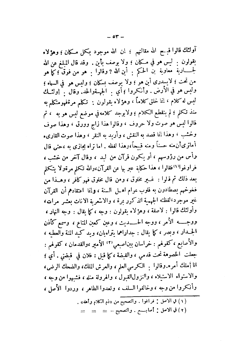 أُولَئِكَ قَالُوا قبح الله مقالتهم إِن الله مَوْجُود بِكُل مَكَان وَهَؤُلَاء يَقُولُونَ لَيْسَ هُوَ فِي مَكَان وَلَا يُوصف بأين وَقد قَالَ الْمبلغ عَن الله لجارية مُعَاوِيَة بن الحكم أَيْن الله وَقَالُوا هُوَ من فَوق كَمَا هُوَ من تَحت لَا يدْرِي أَيْن هُوَ وَلَا يُوصف بمَكَان وَلَيْسَ هُوَ فِي السَّمَاء وَلَيْسَ هُوَ فِي الأَرْض وأنكروا أَي الْجِهَة وَالْحَد وَقَالَ أُولَئِكَ لَيْسَ لَهُ كَلَام إِنَّمَا خلق كلَاما وَهَؤُلَاء يَقُولُونَ تكلم مرّة فَهُوَ مُتَكَلم بِهِ مُنْذُ تكلم لم يَنْقَطِع الْكَلَام وَلَا يُوجد كَلَامه فِي مَوضِع لَيْسَ هُوَ بِهِ ثمَّ قَالُوا لَيْسَ هُوَ صَوت وَلَا حُرُوف وَقَالُوا هَذَا زاج وورق وَهَذَا صوف وخشب وَهَذَا إِنَّمَا قصد بِهِ النقش وَأُرِيد بِهِ النقر وَهَذَا صَوت الْقَارئ أما ترى أَن مِنْهُ خسنا وَمِنْه قبيحا وَهَذَا لَفظه أما ترَاهُ يجازي بِهِ حَتَّى قَالَ رَأس من رؤوسهم أَو يكون قُرْآن من لبد وَقَالَ آخر من خشب فراغوا فَقَالُوا هَذَا حِكَايَة عبر بهَا عَن الْقُرْآن وَالله تكلم مرّة وَلَا يتَكَلَّم بعد ذَلِك ثمَّ قَالُوا غير مَخْلُوق وَمن قَالَ مَخْلُوق فَهُوَ كَافِر وَهَذَا من فخوخهم يصطادون بِهِ قُلُوب عوام أهل السّنة وَإِنَّمَا إعتقادهم أَن الْقُرْآن غير مَوْجُود لفظته الْجَهْمِية الذُّكُور بِمرَّة والأشعرية الْإِنَاث بِعشر مَرَّات وأؤلئك قَالُوا لَا صفة وَهَؤُلَاء يَقُولُونَ وَجه كَمَا يُقَال وَجه النَّهَار وَوجه الْأَمر وَوجه الحَدِيث وَعين كعين الْمَتَاع وَسمع كأذن الْجِدَار وبصر كَمَا يُقَال جدارهما يتراءيان وَيَد كيد الْمِنَّة والعطية والأصابع كَقَوْلِهِم خُرَاسَان بَين إصبعي الْأَمِير وَالْقَدَمَانِ كَقَوْلِهِم جعلت الْخُصُومَة تَحت قدمي والقبضة كَمَا قيل فلَان فِي قبضتي أَي أَنا أملك أمره وَقَالُوا الْكُرْسِيّ الْعلم وَالْعرش الْملك والضحك الرضى والإستواء الِاسْتِيلَاء وَالنُّزُول الْقبُول والهرولة متله فشبهوا من وَجه وأنكروا من وَجه وخالفوا السّلف وتعدوا الظَّاهِر وردوا الأَصْل