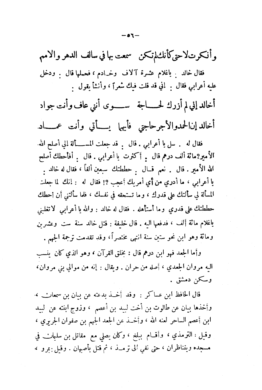 فَقَالَ لَهُ سل يَا أَعْرَابِي قَالَ قد جعلت الْمَسْأَلَة إِلَيّ أصلح الله الْأَمِير مائَة ألف دِرْهَم قَالَ أكثرت ياأعرابي قَالَ أفأحطك أصلح الله الْأَمِير قَالَ نعم قَالَ حططتك سبعين ألفا فَقَالَ لَهُ خَالِد ياأعرابي نَا أَدْرِي من أَي أَمر يَك أعجب فَقَالَ لَهُ إِنَّك لما جعلت الْمَسْأَلَة لي سَأَلتك على قدرك وَمَا تستحقه فِي نَفسك فَلَمَّا سَأَلتنِي أَن أحطك حططتك على قدري وَمَا أستاهله فَقَالَ لَهُ خَالِد وَالله يَا أَعْرَابِي لَا تغلبني يَا غُلَام مائَة ألف فَدَفعهَا إِلَيْهِ قَالَ خَليفَة قتل خَالِد سنة سِتّ وَعشْرين وَمِائَة وَهُوَ ابْن نَحْو سِتِّينَ سنة انْتهى مُخْتَصرا وَقد تقدّمت تَرْجَمَة الجهم