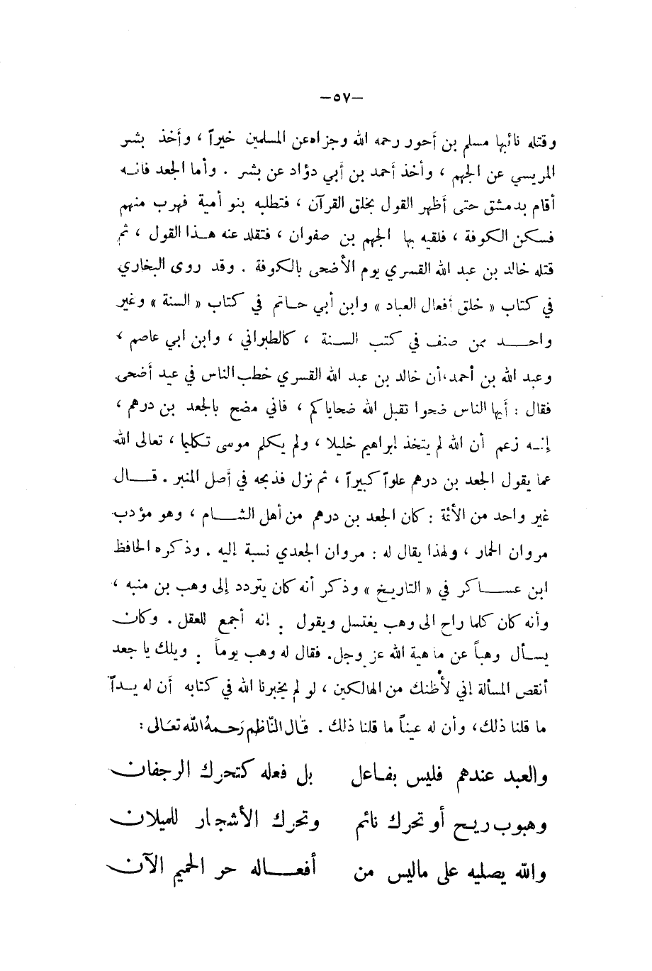 وَقَتله نائبها مُسلم بن أحور رَحمَه الله وجزاه عَن الْمُسلمين خيرا وَأخذ بشر المرسي عَن الجهم وَأخذ أَحْمد بن أبي دؤاد عَن بشر وَأما الْجَعْد فَإِنَّهُ أَقَامَ بِدِمَشْق حَتَّى أظهر القَوْل بِخلق الْقُرْآن فتطلبه بَنو أُميَّة فهرب مِنْهُم فسكن الْكُوفَة فَلَقِيَهُ بهَا الجهم بن صَفْوَان فتقلد عَنهُ هَذَا القَوْل ثمَّ قَتله خَالِد بن عبد الله الْقَسرِي يَوْم الْأَضْحَى بِالْكُوفَةِ وَقد روى البُخَارِيّ فِي كتاب (خلق أَفعَال الْعباد (وَابْن أبي حَاتِم فِي كتاب (السّنة (وَغير وَاحِد مِمَّن صنف فِي كتب السّنة كالطبراني وَابْن أبي عَاصِم وَعبد الله بن أَحْمد ان خَالِد بن عبد الله الْقَسرِي خطب النَّاس فِي عيد أضحى فَقَالَ أَيهَا النَّاس ضحوا تقبل اله ضَحَايَاكُمْ فَإِنِّي مضح بالجعد بن دِرْهَم أَنه زعم أَن الله لم يتَّخذ إِبْرَاهِيم خَلِيلًا وَلم يكلم مُوسَى تكليما تَعَالَى الله عَمَّا يَقُول الْجَعْد بن دِرْهَم علوا كَبِيرا ثمَّ نزل فذبحه فِي أصل الْمِنْبَر قَالَ غير وَاحِد من الْأَئِمَّة كَانَ الْجَعْد بن دِرْهَم من أهل الشَّام وَهُوَ مؤدب مَرْوَان الْحمار وَلِهَذَا يُقَال لَهُ مَرْوَان الْجَعْدِي نِسْبَة إِلَيْهِ وَذكره الْحَافِظ ابْن عَسَاكِر فِي (التَّارِيخ (وَذكر أَنه كَانَ يتَرَدَّد إِلَى وهب بن مُنَبّه وَأَنه كَانَ كلما رَاح إِلَى وهب يغْتَسل وَيَقُول إِنَّه أجمع لِلْعَقْلِ وَكَانَ يسْأَل وهبا عَن مَاهِيَّة الله عز وَجل فَقَالَ لَهُ وهب يَوْمًا وَيلك يَا جعد أنقص الْمَسْأَلَة إِنِّي لأظنك من الهالكين لَو لم يخبرنا الله فِي كِتَابه أَن لَهُ يدا مَا قُلْنَا ذَلِك وَأَن لَهُ عينا مَا قُلْنَا ذَلِك قَالَ النَّاظِم رَحمَه الله تَعَالَى ... وَالْعَبْد عِنْدهم فَلَيْسَ بفاعل