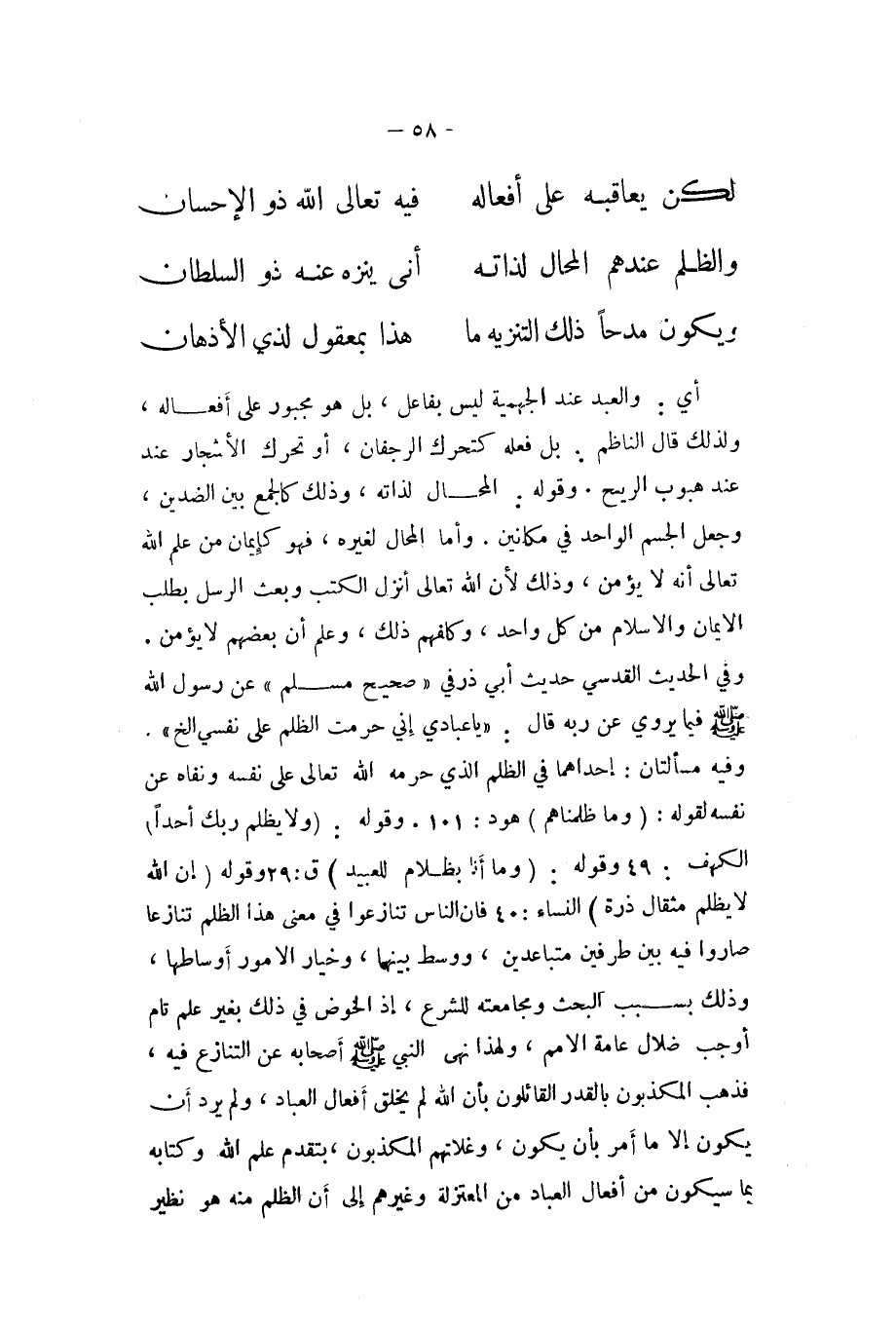 أَي وَالْعَبْد عِنْد الْجَهْمِية لَيْسَ بفاعل بل هُوَ مجبور على أَفعاله وَلذَلِك قَالَ النَّاظِم بل فعله كتحرك الرجفان أَو تحرّك الْأَشْجَار عِنْد عِنْد هبوب الرّيح وَقَوله الْمحَال لذاته وَذَلِكَ كالجمع بَين الضدين وَجعل الْجِسْم الْوَاحِد فِي مكانين وَأما الْمحَال لغيره فَهُوَ كَإِيمَانِ من علم الله تَعَالَى أَنه لَا يُؤمن وَذَلِكَ لِأَن الله تَعَالَى أنزل الْكتب وَبعث الرُّسُل بِطَلَب الْإِيمَان والاسلام من كل وَاحِد وكلفهم ذَلِك وَعلم أَن بَعضهم لَا يُؤمن وَفِي الحَدِيث الْقُدسِي حَدِيث أبي ذَر فِي (صَحِيح مُسلم (عَن رَسُول الله صلى الله عَلَيْهِ وَسلم فِيمَا يروي عَن ربه قَالَ (يَا عبَادي إِنِّي حرمت الظُّلم على نَفسِي الخ (وَفِيه مَسْأَلَتَانِ إِحْدَاهمَا فِي الظُّلم الَّذِي حرمه الله تَعَالَى على نَفسه ونفاه عَن نَفسه لقَوْله {وَمَا ظلمناهم} هود 101 وَقَوله {وَلَا يظلم رَبك أحدا} الْكَهْف 49 وَقَوله {وَمَا أَنا بظلام للعبيد} ق 29 وَقَوله {إِن الله لَا يظلم مِثْقَال ذرة} النِّسَاء 40 فان النَّاس تنازعوا فِي معنى هَذَا الظُّلم تنَازعا صَارُوا فِيهِ بَين طرفين متباعدين ووسط بَينهمَا وَخيَار الامور أوساطها وَذَلِكَ بِسَبَب الْبَحْث ومجامعته للشَّرْع اذ الْخَوْض فِي ذَلِك بِغَيْر علم تَامّ أوجب ضلال عَامَّة الامم وَلِهَذَا نهى النَّبِي صلى الله عَلَيْهِ وَسلم أَصْحَابه عَن التَّنَازُع فِيهِ فَذهب المكذبون بِالْقدرِ الْقَائِلُونَ بِأَن الله لم يخلق أَفعَال الْعباد وَلم يرد أَن يكون إِلَّا مَا أَمر بِأَن يكون وغلاتهم المكذبون بتقدم علم الله وَكِتَابَة بِمَا سَيكون من أَفعَال الْعباد من الْمُعْتَزلَة وَغَيرهم إِلَى أَن الظُّلم مِنْهُ هُوَ نَظِير