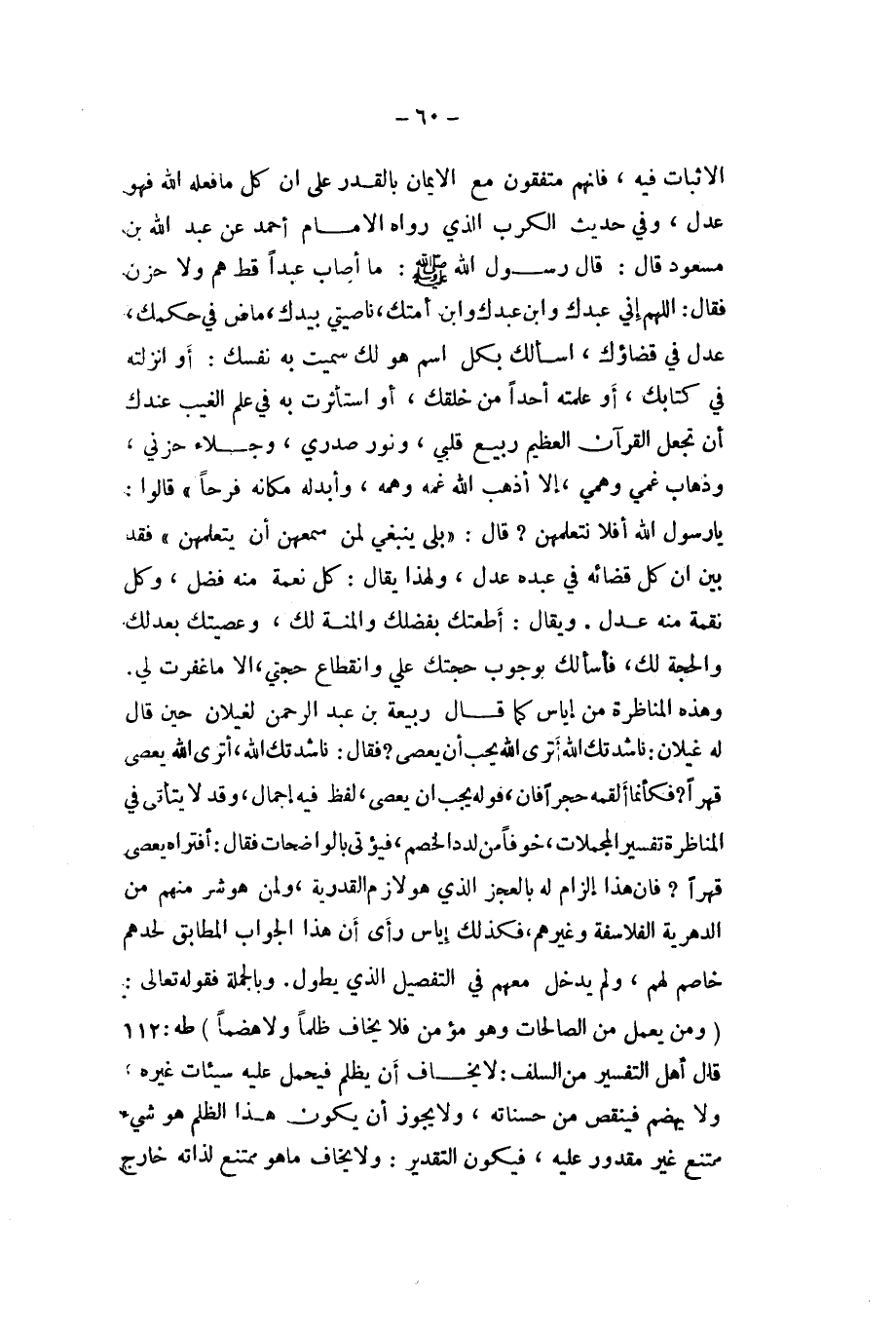 الاثبات فِيهِ فانهم متفقون مَعَ الايمان بِالْقدرِ على ان كل مَا فعله الله فَهُوَ عدل وَفِي حَدِيث الكرب الَّذِي رَوَاهُ الامام أَحْمد عَن عبد الله بن مَسْعُود قَالَ قَالَ رَسُول الله صلى الله عَلَيْهِ وَسلم مَا أصَاب عبد قطّ هم وَلَا حزن فَقَالَ اللَّهُمَّ إِنِّي عَبدك وَابْن عَبدك وَابْن أمتك ناصيتي بِيَدِك مَاض فِي حكمك عدل فِي قضاؤك اسألك بِكُل اسْم هُوَ لَك سميت بِهِ نَفسك أَو انزلته فِي كتابك أَو عَلمته أحدا من خلقك أَو استأثرت بِهِ فِي علم الْغَيْب عنْدك أَن تجْعَل الْقُرْآن الْعَظِيم ربيع قلبِي وَنور صَدْرِي وجلاء حزني وَذَهَاب غمي وهمي إِلَّا إِلَّا أذهب الله غمه وهمه وأبدله مَكَانَهُ فَرحا (قَالُوا يَا رَسُول الله أَفلا نتعلمهن قَالَ (بلَى يَنْبَغِي لمن سمعهن أَن يتعلمهن (فقد بَين ان كل قَضَائِهِ فِي عَبده عدل وَلِهَذَا يُقَال كل نعْمَة مِنْهُ فضل وكل نقمة مِنْهُ عدل وَيُقَال أطعتك بِفَضْلِك والْمنَّة لَك وعصيتك بعدلك وَالْحجّة لَك فأسألك بِوُجُوب حجتك عَليّ وَانْقِطَاع حجتي الا مَا غفرت لي وَهَذِه المناظرة من إِيَاس كَمَا قَالَ ربيعَة بن عبد الرَّحْمَن لغيلان حِين قَالَ لَهُ غيلَان ناشدتك الله أَتَرَى الله يحب أَن يعْصى فَقَالَ ناشدتك الله أَتَرَى الله يعْصى قهرا فَكَأَنَّمَا ألقمه حجرا فان قَوْله يجب ان يعْصى لفظ فِيهِ إِجْمَال وَقد لَا يَتَأَتَّى فِيهِ المناظرة تَفْسِير المجملات خوفًا من لدد الْخصم فَيُؤتى بالواضحات فَقَالَ أفتراه يعْصى قهرا فان هَذَا إِلْزَام لَهُ بِالْعَجزِ الَّذِي هُوَ لَازم الْقَدَرِيَّة وَلمن هُوَ شَرّ مِنْهُم من الدهرية الفلاسفة وَغَيرهم فَكَذَلِك إِيَاس رأى أَن هَذَا الْجَواب المطابق لحدهم خَاصم لَهُم وَلم يدْخل مَعَهم فِي التَّفْصِيل الَّذِي يطول وبالجملى فَقَوله تَعَالَى {وَمن يعْمل من الصَّالِحَات وَهُوَ مُؤمن فَلَا يخَاف ظلما وَلَا هضما} طه 112 قَالَ أهل التَّفْسِير من السّلف لَا يخَاف أَن يظلم فَيحمل عَلَيْهِ سيئات غَيره وَلَا يهضم فينقص من حَسَنَاته وَلَا يجوز أَن يكون هَذَا الظُّلم هُوَ شَيْء مُمْتَنع غير مَقْدُور عَلَيْهِ فَيكون التَّقْدِير وَلَا يخَاف مَا هُوَ مُمْتَنع لذاته خَارج
