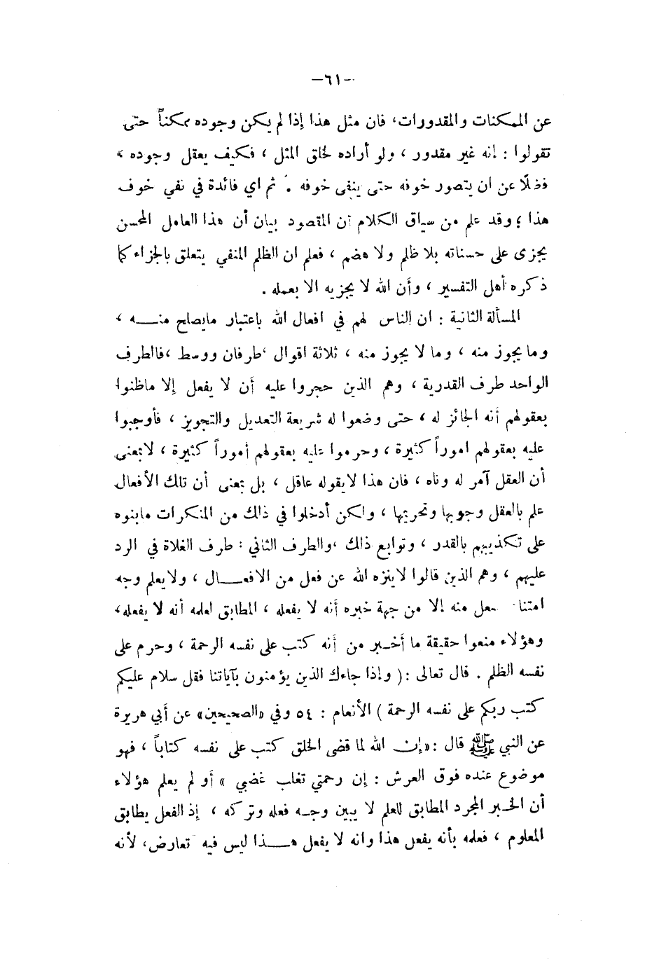 الْمَسْأَلَة الثَّانِيَة ان النَّاس لَهُم فِي افعال الله بِاعْتِبَار مَا يصلح مِنْهُ وَمَا يجوز مِنْهُ وَمَا لَا يجوز مِنْهُ ثَلَاثَة اقوال طرفان ووسط فالطرف الْوَاحِد طرف الْقَدَرِيَّة وهم الَّذين حجروا عَلَيْهِ أَن لَا يفعل إِلَّا مَا ظنُّوا بعقولهم أَنه الْجَائِز لَهُ حَتَّى وضعُوا لَهُ شَرِيعَة التَّعْدِيل والتجويز فأوجبوا عَلَيْهِ بعقولهم امورا كَثِيرَة وحرموا عَلَيْهِ بعقولهم أمورا كَثِيرَة لَا بِمَعْنى أَن الْعقل آمُر لَهُ وناه فَإِن هَذَا لَا يَقُوله عَاقل بل بِمَعْنى ان تِلْكَ الافعال علم بِالْعقلِ وُجُوبهَا وتحريمها وَلَكِن أدخلُوا فِي ذَلِك من الْمُنْكَرَات مَا بنوه على تكذيبهم بِالْقدرِ وتوابع ذَلِك والطرف الثَّانِي طرف الغلاة فِي الرَّد عَلَيْهِم وهم الَّذين قَالُوا لَا ينزه الله عَن فعل من الافعال وَلَا يعلم وَجه امْتنَاع جعل مِنْهُ الا من جِهَة خَبره أَنه لَا يَفْعَله المطابق لعلمه أَنه لَا يَفْعَله وَهَؤُلَاء منعُوا حَقِيقَة مَا أخبر من أَنه كتب على نَفسه الرَّحْمَة وَحرم على نَفسه الظُّلم قَالَ تَعَالَى {وَإِذا جَاءَك الَّذين يُؤمنُونَ بِآيَاتِنَا فَقل سَلام عَلَيْكُم كتب ربكُم على نَفسه الرَّحْمَة} الانعام 54 وَفِي (الصَّحِيحَيْنِ (عَن أبي هُرَيْرَة عَن النَّبِي صلى الله عَلَيْهِ وَسلم قَالَ (إِن الله لما قضى الْخلق كتب على نَفسه كتابا فَهُوَ مَوْضُوع عِنْده فَوق الْعَرْش إِن رَحْمَتي تغلب عضبي (أَو لم يعلم هَؤُلَاءِ أَن الْخَبَر الْمُجَرّد المطابق للْعلم لَا يبين وَجه فعله وَتَركه إِذْ الْفِعْل يُطَابق الْمَعْلُوم فَعلمه بِأَنَّهُ يفعل هَذَا وانه لَا يفعل هَذَا لَيْسَ فِيهِ تعَارض لِأَنَّهُ