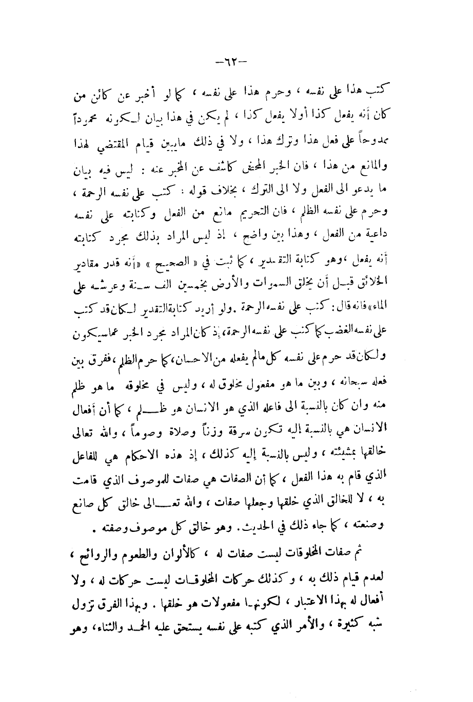 كتب هَذَا على نَفسه وَحرم هَذَا على نَفسه كَمَا لَو أخبر عَن كَائِن من كَانَ أَنه يفعل كَذَا أَولا يفعل كَذَا لم يكن فِي هَذَا بَيَان لكَونه مَحْمُودًا ممدوحا على فعل هَذَا وَترك هَذَا وَلَا فِي ذَلِك مَا يبين قيام الْمُقْتَضِي لهَذَا وَالْمَانِع من هَذَا فَإِن الْخَبَر الْمُصَفّى كاشف عَن الْمخبر عَنهُ لَيْسَ فِيهِ بَيَان مَا يَدْعُو الى الْفِعْل وَلَا الى التّرْك بِخِلَاف قَوْله كتب على نَفسه الرَّحْمَة وَحرم على نَفسه الظُّلم فان التَّحْرِيم مَانع من الْفِعْل وكتابته على نَفسه دَاعِيَة من الْفِعْل وَهَذَا بَين وَاضح اذ لَيْسَ المُرَاد بذلك مُجَرّد كِتَابَته أَنه يفعل وَهُوَ كِتَابَة التَّقْدِير كَمَا ثَبت فِي (الصَّحِيح ((انه قدر مقادير الْخَلَائق قبل أَن يخلق السَّمَوَات والارض بِخَمْسِينَ الف سنة وعرشه على المَاء (فانه قَالَ كتب على نَفسه الرَّحْمَة وَلَو أُرِيد كِتَابَة التَّقْدِير لَكَانَ قد كتب على نَفسه الْغَضَب كَمَا كتب على نَفسه الرَّحْمَة إِذْ كَانَ المُرَاد مُجَرّد الْخَبَر عَمَّا سَيكون ولكان قد حرم على نَفسه كل مَا لم يَفْعَله من الاحسان كَمَا حرم الظُّلم فَفرق بَين فعله سُبْحَانَهُ وَبَين مَا هُوَ مفعول مَخْلُوق لَهُ وَلَيْسَ فِي مخلوقه مَا هُوَ ظلم مِنْهُ وان كَانَ بِالنِّسْبَةِ الى فَاعله الَّذِي هُوَ الانسان هُوَ ظلم كَمَا أَن أَفعَال الانسان هِيَ بِالنِّسْبَةِ أليه تكون سَرقَة وزنا وَصَلَاة وصوما وَالله تَعَالَى خَالِقهَا بمشيئته وَلَيْسَ بِالنِّسْبَةِ أليه كَذَلِك إِذْ هَذِه الاحكام هِيَ للْفَاعِل الَّذِي قَامَ بِهِ هَذَا الْفِعْل كَمَا أَن الصِّفَات هِيَ صِفَات للموصوف الَّذِي قَامَت بِهِ لَا للخالق الَّذِي خلقهَا وَجعلهَا صِفَات وَالله تَعَالَى خَالق كل صانع وصنعته كَمَا جَاءَ ذَلِك فِي الحَدِيث وَهُوَ خَالق كل مَوْصُوف وَصفته